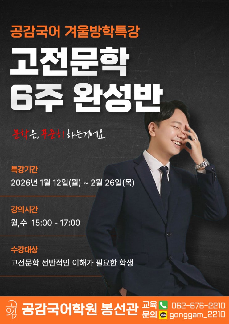 안녕하세요. 공감국어 봉선관입니다. 2026 겨울 방학 특강의 첫번째 강의는 공감국어 박충헌 대표님의 고전문학 6주 완성반입니다. 고전문학, 옛말과 한자어 때문에 막막하게 느껴졌던 고전 시가 파트! 암기만으로 다가오는 내신 시험과 수능을 대비하기엔 어떻게 공부를 해야 할지, 어떤 작품부터 시작해야 될지 어려운 과목입니다. 하지만 고전 시가는 모의고사와 수능 문학 필수 영역입니다. 더불어 고등부 내신 시험에도 문학 문제들을 변형하여 출제하고 있죠 이번 겨울 방학 특강 - 고전문학 강의를 통해 단순히 암기만으로 그치지 않고, 고등부 교과서에 수록되어 있는 주요 작품들을 시대별, 갈래별로 고전문학 작품들의 개념 + 해당 작....... <img src="https://blogthumb.pstatic.net/MjAyNTEyMTFfNzYg/MDAxNzY1NDMzNjg2ODk5.Vsmff3btTJNFWL2mhj6NGemRUtHn3ZfULnBkDR_RPIwg.6xv13nqXEdOyk-NJ-vjGVOpWysAAA7Bgi10KSxYbwmMg.JPEG/%BA%C0%BC%B1%B0%FC%B0%DC%BF%EF%B9%E6%C7%D0%C6%AF%B0%AD-%BD%C3%B0%A3%C7%A5-004.jpg?type=s3" />