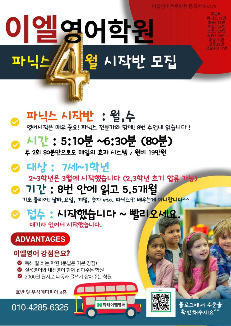 3월에 2~3학년 반 시작했습니다. (혹시 놓치신 학부모님 서두르세요^^) 이 반은 2:20~3:50분 (80분 수업) 5개월 주 2회 횟수도 적은데, 월, 수 주 2회 5개월 과정 + 기초영어 Daily English expressions + Basic reading까지!! 당시 광고를 하고, 많이 모이는 학년을 시작하다 보니 1학년을 못 받았습니다. 그래서 4월에 또 한 번 개설합니다. 이번에는 7세~1학년입니다. 아래 시간표 있습니다. 파닉스만 지도하는 게 아니고, 기초영어 Daily English expressions + Basic reading까지!! "학습의 본질을 꿰뚫는 지도, 호반 앞 초등영어의 중심 이엘영어학원입니다." "제대로 된 학습법으로 진짜 실력을 키우는, 호반 앞 초등영어....... <img src="https://blogthumb.pstatic.net/MjAyNjAzMDZfODkg/MDAxNzcyNzY3MzU5MDUw.XpBPnNzbQkuKsap4U-kFVCJcfHkPV6_U77hRck-0mEsg.J7Mm8a61ekjBmWXoE0FShRS3xUUGM_4XkJDZ5IGrhRUg.JPEG/%BF%A4%BA%A3%B1%A4%B0%ED%C6%C4%B4%D0%BD%BA%C0%CC%BF%A4_%281%29.jpg?type=s3" />
