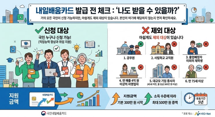 건축목공기술자의 꿈을 실현하고자하는 분들 중 많은분들이 '국민내일배움카드'를 활용하셔서 국비지원 무료교육을 받고 있습니다. 그러나 이런 혜택에 대해 모르고 계신 분들 또한 많으며 국비지원교육 이라는 혜택을 노치시는 분들이 있어 '국민내일배움카드'를 어떻게 발급받고 활용하는지 2026년 현재 기준으로 발급방법을 온라인과 오프라인으로 나누어 정리해 드리겠습니다. 1. 발급 전 체크 : "나도 받을 수 있을까?" 거의 모든 국민이 신청 가능하지만, 아쉽게도 제외 대상이 있습니다. 본인이 여기에 해당하지 않는지 먼저 확인하세요. 제외 대상: 공무원, 사립학교 교직원, 졸업예정자 이외의 재학생, 연....... <img src="https://blogthumb.pstatic.net/MjAyNjAzMDlfMjgz/MDAxNzczMDM0NDgxMTEw.3_XHneAwziIFqQAKTiaADZf-zqlw_xwZkF5GR7B_3JYg.sPfd2OuNdskAYXeJ3V1GpNaLeufqzsQEg1GLoO96pFog.JPEG/Gemini_Generated_Image_517fqa517fqa517f_copy.jpg?type=s3" />