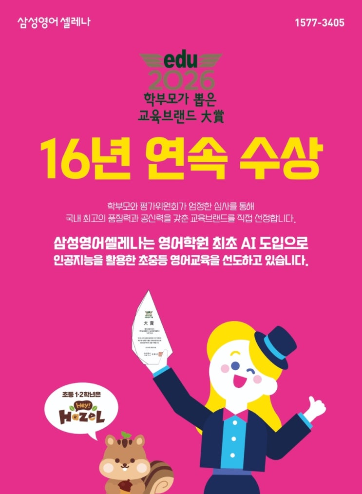 16년 연속 1위의 비결! "처음 시작하는 영어, 아이가 즐거워해야 합니다. 초등 1·2학년을 위한 맞춤형 프로그램 'Hey, Hazel'부터 AI와 함께하는 스마트한 학습까지! 왜 16년 동안이나 학부모님들의 압도적인 선택을 받았는지 직접 경험해 보세요. 우리 동네 No.1 삼성영어셀레나에서 아이의 가능성이 터집니다." 삼성영어셀레나 훈민학원 ❤️교육상담 010-5189-5909❤️ <img src="https://blogthumb.pstatic.net/MjAyNjAzMDhfMzkg/MDAxNzcyOTQ1Nzc4NTc1.XcU0qQG3PIvYPhd3LZo8OTt5Cl5kR2h11_eXWhJz4Ucg.hEajJBFB9qnPEZg6G-US-l6Kq6o44xb52_CRDBnsd10g.JPEG/F8A1E8AA%A3%AD07A3%A3%AD4B45%A3%ADAAFA%A3%AD360E3CF30ABB.jpg?type=s3" />