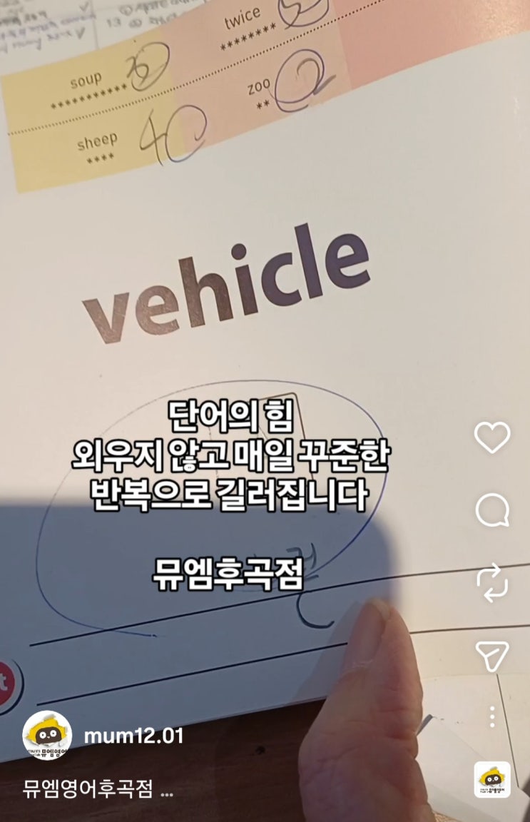 단어 외우기 시스템으로 힘들이지 않고 가능합니다 단어 암기를 한다고 하면 첫번쨰 방법은 무조건 암기입니다 읽는 법도 모르고 어떻게 소리가 나는지 생각해보지도 않고 종이에 까먹게 적고 또 적습니다 물론 급하게 단시간에 외워야 한다면 그 방법도 맞겠지만, 활용적인 면에서는 확실히 떨어집니다 더욱이 초등학생들 단어 공부는 달라야 합니다 중학생들처럼 어려운 어휘를 접하기전 필요한 어휘를 충분히 숙지 되어야 합니다 실제 생활속에서 접하는 단어를 많이 보고 발화해봐야 됩니다 그렇기 때문에 뮤엠영어 단어 v system이 잘 만들어진 교재라는 사실은 확실합니다 기초 단어 부터 쌓고 쌓아 가면 고학년 어휘도 어느순간 암기 되어....... <img src="https://blogthumb.pstatic.net/MjAyNjAzMjJfMTEg/MDAxNzc0MTU5ODQ1NTQ2.8fjU_qB5fey6g37e9ACDUsR3LTPPKyd5XF4RykO2et8g.Fe5R78lPKiICIL2bg9dxqxkfCTwCaktHqq2gjB-p1pog.JPEG/KakaoTalk_20260322_150619477.jpg?type=s3" />