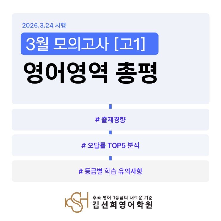 3월 모의고사가 고생 많으셨습니다. 처음 접하는 고등학교 1학년, 그리고 어쩌면 나의 수능까지 결과를 결정해줄 고등학교 3학년까지 모두 고생 많으셨습니다. 영어와 국어 다 어려웠다는 평이 나오는데... 왜 그랬을까요? "본질"과 "생각"이 없기 때문입니다. 결국 과열될 정도로 공부한 친구들이 많기 때문에 변별력을 유지하기 위해서는 "단어는 쉽게, 그런데 문장 구성은 헷갈리게"라는 방법을 쓸 수 밖에 없습니다. 단어는 열심히 암기하셔야 하고, 문장을 보면서 무슨 얘기를 하는지 최소 3개의 힌트에서 찾아보는 연습이 필요합니다. 결국 본질은 같습니다. "단어 공부 열심히." 그리고 "나....... <img src="https://blogthumb.pstatic.net/MjAyNjAzMjRfMTYx/MDAxNzc0MzM5MDI1Njk3.jnxBQpE8Dx8--UrLF_oJzRw_dkEtAG0rgMaGHxRiWtwg.wXemxJzCZIAd3uN_20jBtxvF8revDgpW6bHmMoI6sFIg.PNG/6412c88c-2b21-4852-891a-f6fcfffedf66.png?type=s3" />