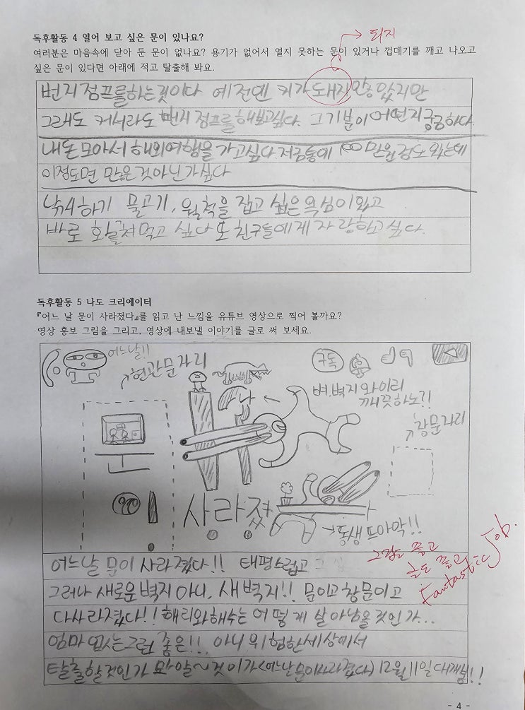 『어느 날 문이 사라졌다』 독후 활동 김은영 글 / 문학동네 여러분은 '문이 사라졌다' 하면 '대학문, 취업문' 뭐 이런 것만 떠오르시죠? "요즘 취업의 문이 사라졌다" "대학 문이 너무 좁아 청소년들이 불쌍하다." 그런데 오늘 소개하는 책은 진짜 문이 사라집니다. 집 대문과 창문이 사라져 컨테이너 같은 박스에 우리 아이들이 갇히게 됩니다. . 과연 이게 가능한 얘기일까요? 예스 24(2026.3월 기준) 132명의 평점 10.0점인 책!!! 『어느 날 문이 사라졌다』책 소개 제25회 문학동네어린이문학상 수상작 우리 집이 거대한 택배 상자처럼 변했다! 현관문도 창문도 사라진 집에 갇혀 버린 아이들 아웅....... <img src="https://blogthumb.pstatic.net/MjAyNjAzMDVfMzQg/MDAxNzcyNjk0NDI1NDEw.B9Apt31BjADTxJl70Jbn5xJcYSAB5QwnxgSkRPP4FU0g.u_SycV7SXgyzHofxmY4U62ssqII5fn_zWKRE41b4XN4g.JPEG/4-1.jpg?type=s3" />