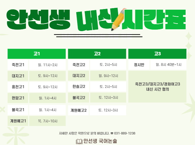 수지죽전 안선생 국어논술) 2026년 1학기 고등부 내신 시간표 안내