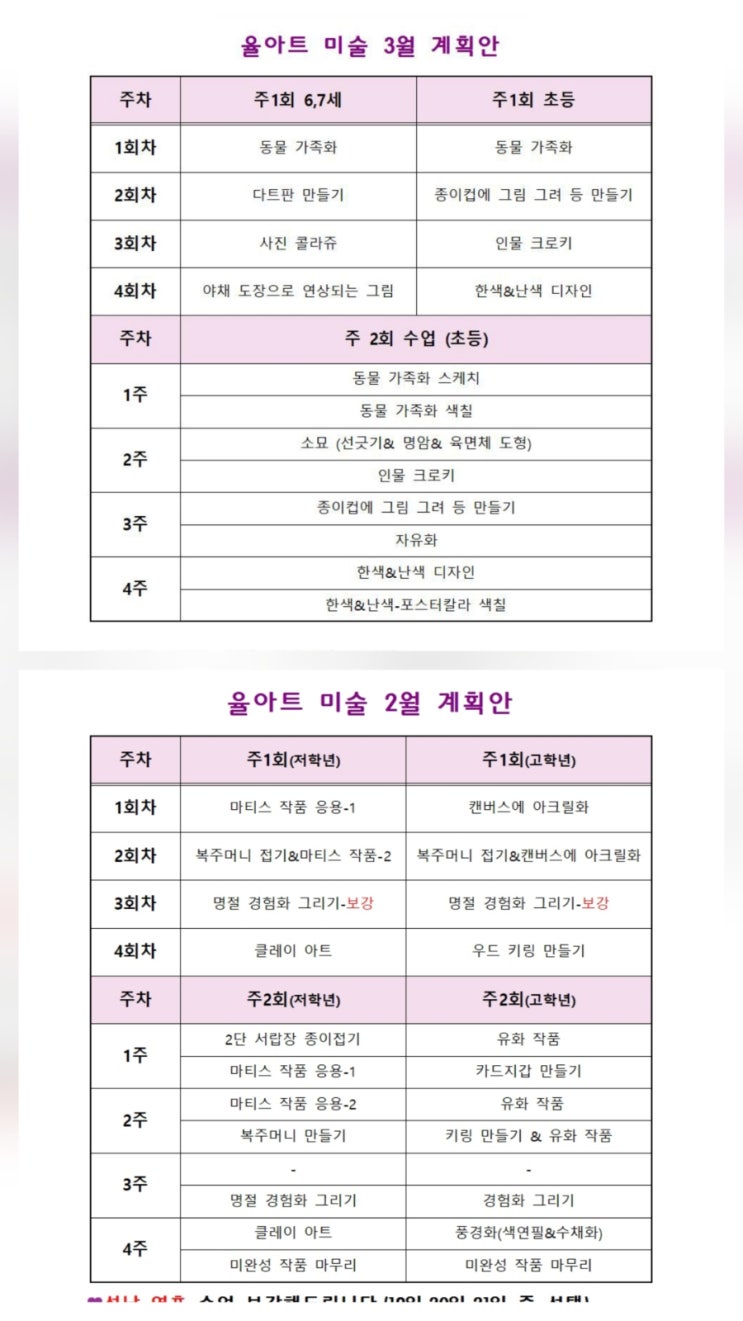 율아트 미술 신학기 모집~ ♡수업시간 월,화,수,목 : 3시 & 4시30분 (앞,뒤 30분 유동적으로 진행) 금 : 보강수업(변동가능) 토 : 2시~3시30분(변동가능) ♡한타임 인원 2명~최대5명 소수정예 ♡수업내용 드로잉(수채화,소묘,아크릴,유화등) 조형활동(아이클레이,종이접기, 모루,쿠킹 등) ♡수업시간 주1회- 90분수업 주2회- 70분수업 ※선착순으로 수업시간 정해지니 문의 바랍니다.(031-262-6520) <img src="https://blogthumb.pstatic.net/MjAyNjAyMTlfMTQ4/MDAxNzcxNTA3MDk5OTQx.bJESp8grCsp5ycL3Ha9Obho8OZHZLt7bfJkshkxgQ-4g.r2vXgkC6BmBqm7TgopLM-2aMfuH88FFU0az54kx4nM8g.JPEG/900%A3%DF20260219%A3%DF211256.jpg?type=s3" />