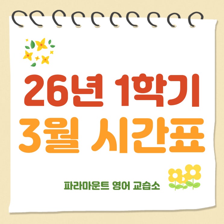3월 신학기 개강 및 수업 시간표 안내 안녕하세요, 파라마운트 영어 교습소입니다. 어느덧 차가운 겨울바람이 물러가고, 새로운 시작을 알리는 3월이 다가왔습니다. 새 학년, 새 학기를 맞이하는 우리 학생들의 설렘이 성장의 확신으로 바뀔 수 있도록, 파라마운트 영어는 더욱 탄탄해진 커리큘럼과 세심한 관리로 이번 학기를 준비했습니다. 아래와 같이 2026년 3월 정규 수업 시간표를 안내해 드리오니, 학생들의 수업 일정 확인에 참고해 주시기 바랍니다. :) #파라마운트영어 #파라마운트영어교습소 #운양동영어학원 #운양동영어 #운양동고등영어 #운양동중등영어 #운양동학원 #운양동내신 #운양동영어내신학원 #김포제일고 #운양....... <img src="https://blogthumb.pstatic.net/MjAyNjAzMDRfMjg1/MDAxNzcyNjExNDAyNzk5.pG8NRM2v0OBg3H1qPG2N-Xp4AY7SO2sAATZsw0i90vcg.kBE4030aA3ZmzGA3L7-WQNdH1GE8fu9hkgu5OSCKKwUg.JPEG/26%B3%E2_3%BF%F9.jpg?type=s3" />