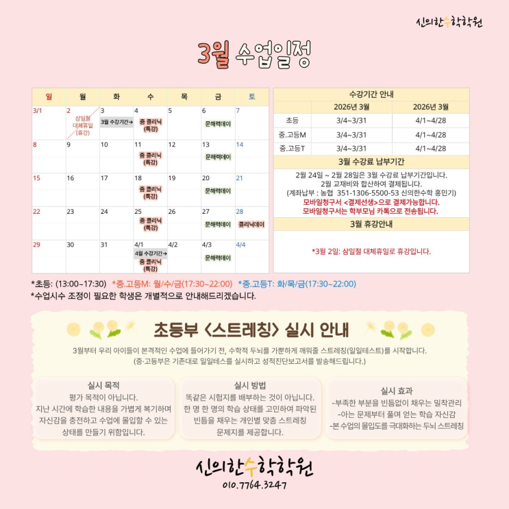 안녕하세요 학생·학부모 여러분, 원수학학원입니다. 이번 주부터 3월 신학기 시작입니다. 새로운 학년, 새로운 반, 새로운 선생님 등 많은 것이 변하는 시기인 만큼 설레기도 긴장되기도 하는 시기인 듯합니다. 3월은 새로운 학년의 1학기의 첫 시작으로 앞으로의 1년을 잘 운영해나가기 위한 방향을 정하는 중요한 시기이기도 합니다. 저희 원수학학원은 학원 학생들이 새로운 시작을 가벼운 마음으로 힘차게 시작할 수 있도록 방학 동안 학생들과 선생님들께서 같이 열심히 준비해왔습니다. 방학이 끝나고 신학기가 시작되었다고 해서 늦은 것이 아닙니다. 3월에 ‘어떤 부분이 부족한지’, ‘어떤 방향으로 공부해야 하는지’ 다시 재정비하고....... <img src="https://blogthumb.pstatic.net/MjAyNjAzMDVfMjgy/MDAxNzcyNjg1MjgyMTA2.Guem9SnYmVQh65y3huEeWGH-tY_t6CFc-I9X2mXuHb0g.yhy3Zf7_p6khUsD0-zpUGXES0eyluKPvI_2WNTQEXRAg.PNG/image01.png?type=s3" />