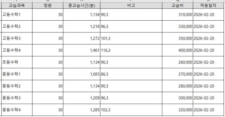 2026년 3월 권태금수학학원 교육비 안내입니다.