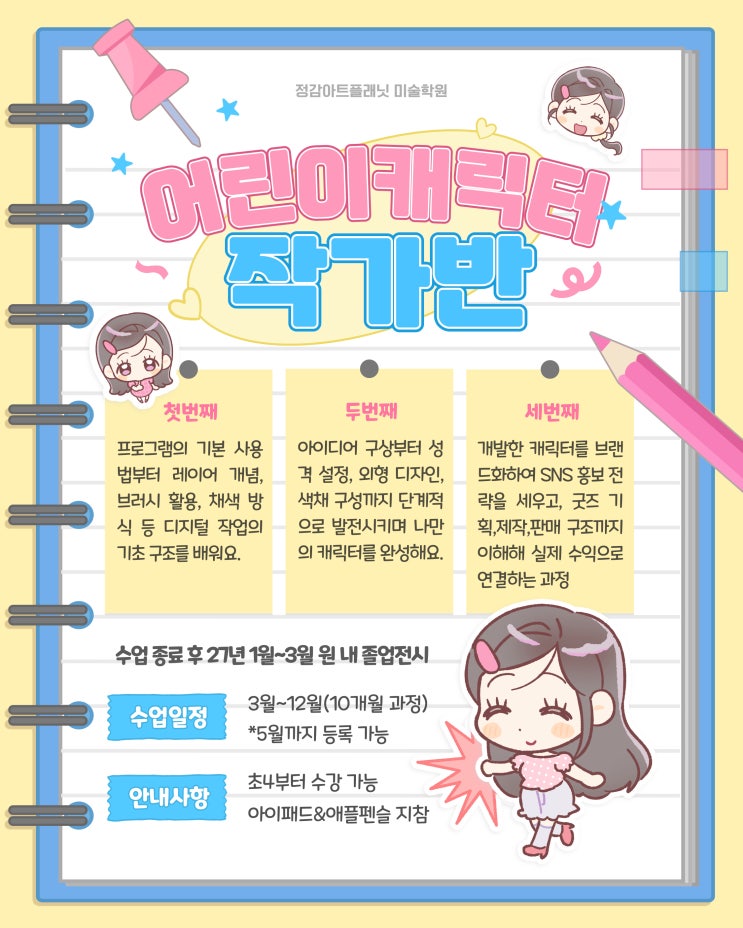 : 정감아트플래닛 미술학원 : 캐릭터작가반 수업 안내 ‘콘텐츠를 만드는 어린 작가’로 성장하는 과정을 경험하는 수업 어린이 캐릭터 작가반은 디지털 드로잉을 기반으로 나만의 캐릭터를 개발하고, 이를 실제 콘텐츠와 상품으로 확장해보는 창작 프로젝트 수업입니다. 단순히 그림을 잘 그리는 것에 머무르지 않고 아이디어 → 캐릭터 디자인 → 스토리 → 홍보 → 굿즈 제작까지 이어지는 캐릭터 창작의 전체 과정을 경험하게 됩니다. 수업에서는 디지털 드로잉 프로그램 사용법을 배우는 것부터 시작해 캐릭터의 성격과 세계관 설정, 디자인 개발, 색채 구성 등을 통해 자신만의 캐릭터를 완성합니다. 이후 완성된 캐릭터를 활용해 SNS 홍보....... <img src="https://blogthumb.pstatic.net/MjAyNjAzMDVfMTc5/MDAxNzcyNjk2OTg3MDM2.mASVEZCLZ0U6wUfG0Z07yctVq_O4Nz8zdOXrhlE1idQg.hOVlGA4GuOGgp8YF7TDELn6qbS8_e4tvEgnc2EbLt3cg.JPEG/%C1%A6%B8%F1%C0%BB_%C0%D4%B7%C2%C7%CF%BC%BC%BF%E4_%284%29_%BA%B9%BB%E7%BA%BB.jpg?type=s3" />