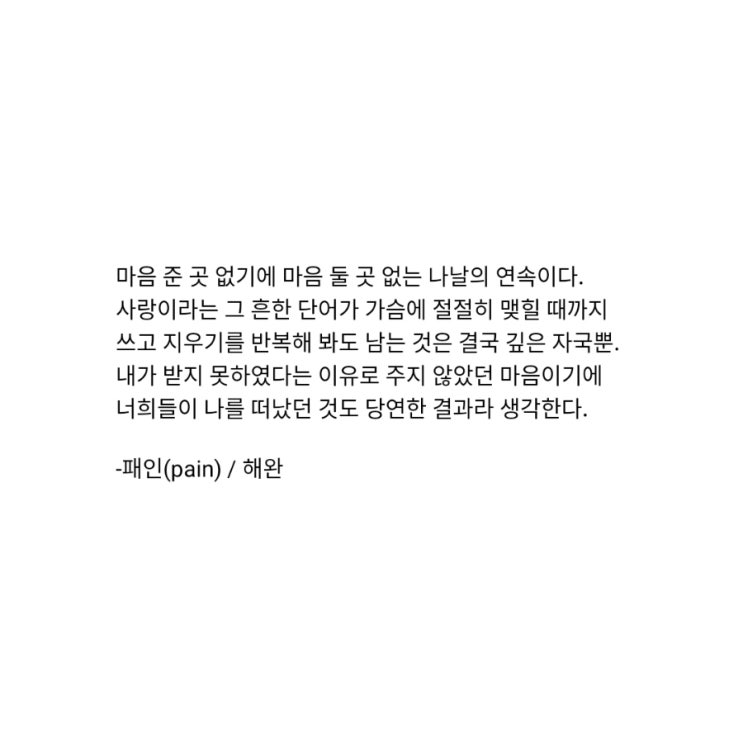 마음 준 곳 없기에 마음 둘 곳 없는 나날의 연속이다. 사랑이라는 그 흔한 단어가 가슴에 절절히 맺힐 때까지 쓰고 지우기를 반복해 봐도 남는 것은 결국 깊은 자국뿐. 내가 받지 못하였다는 이유로 주지 않았던 마음이기에 너희들이 나를 떠났던 것도 당연한 결과라 생각한다. -패인(pain) / 해완 <img src="https://blogthumb.pstatic.net/MjAyNjAzMDlfMjUy/MDAxNzczMDYwNDQ4ODgz._tgWJ8e1v4NLft9M8ILhdOKlKAOBbWrpC9qsIs9pB1wg.447_pNqmH-LjraCCvnIFAxFXjz67jyfmthMTjEOcRhQg.JPEG/900%A3%DF20260309214709.jpg?type=s3" />