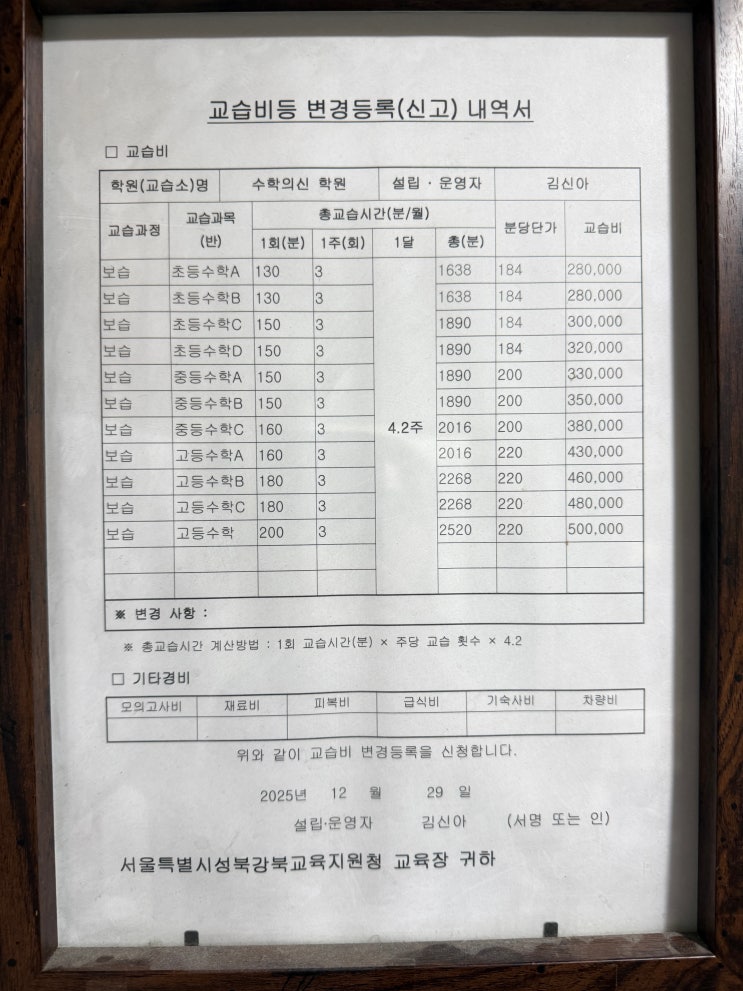 교습비 및 등록번호 공지