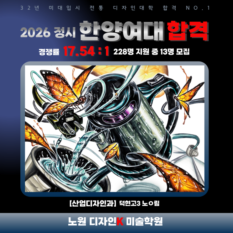디자인K미술학원의 합격 신화는 올해도 계속됩니다! 현재 다양한 32주년 기념 이벤트가 진행 중입니다. K의 더 다양한 이야기가 궁금하시다면 방문 상담 연락 주세요^^ 카카오 채널 / 네이버톡톡 / 전화로 빠른 문의 가능합니다. ☎ 02-952-0624(5) 지하철 이용시 노원역 7호선 4번출구 생폴드방스 방면으로 2개 횡단보도 건너 왼쪽방향 노원역 4호선 2번출구 이니스프리 왼쪽방향 문화의 거리 직진 대로변 횡단보도 건너 오른쪽방향 1층 베스킨라빈스 및 미래팜약국 건물 8층입니다! 자가용 이용시 학원 뒷편으로 오시면 지상 및 지하주차장(B2,B3) 있습니다. 카카오 채널 ' 디자인K ' http://pf.kakao.com/_WAEFG 입시반 인스타 ( ˵....... <img src="https://blogthumb.pstatic.net/MjAyNjAzMDVfMjM0/MDAxNzcyNzEwNTY3MTg0.LVVZg33fHOEixcSYgG3TDa56B5-5ksEZz5KpAVBE0dwg.NMWHQ5TGJ60QsqQBhPzfdoVmjYjixYmmoB9IuxEtfGEg.PNG/%C1%A4%BD%C3_%C7%D1%BE%E7%BF%A9%28%BB%EA%BE%F7%29_%B3%EB%C7%D8%B8%B2.png?type=s3" />