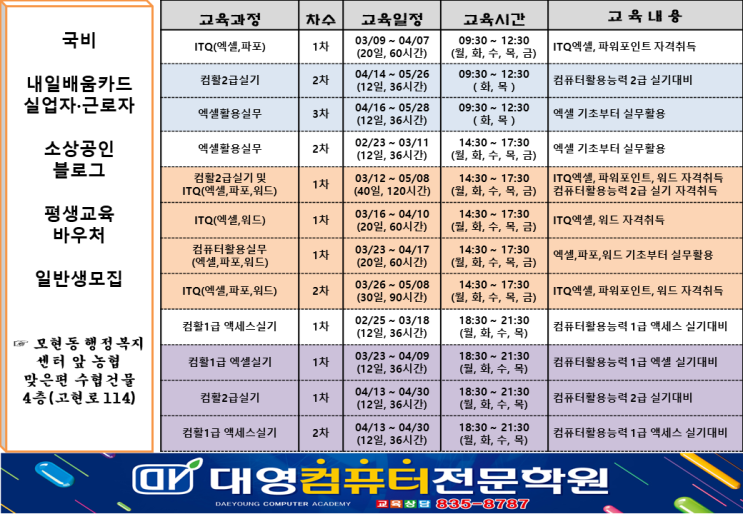 익산컴퓨터 모현동 대영컴퓨터전문학원 교육생 모집 안녕하세요! 새로운 시작을 준비하고 계신가요? 진로 전환, 취업 준비, 또는 자기계발을 위한 국비지원 교육과정을 찾고 계시다면, 지금이 바로 기회입니다! 국비지원 교육! 지금 바로 시작하세요 – 모현동에서 가까운 교육기관 안내 이곳에서는 내일배움카드를 활용한 다양한 교육 과정이 운영 중이며, 실업자, 재직자, 소상공인 모두 수강이 가능합니다. 또한 평생교육 바우처를 통해 일반생도 지원받을 수 있어, 학습의 기회를 놓치지 마세요! 수강신청 방법 내일배움카드 소지자는 고용24 사이트 또는 방문 신청 소상공인·일반인은 평생교육 바우처 이용 가능 좌석 제한 있어 선착순....... <img src="https://blogthumb.pstatic.net/MjAyNjAzMDRfMjk0/MDAxNzcyNTg2ODY0MjUy.t59V9mahwSO8f250BA1DTr7DJFERdgN_LXfwsyu_ROQg._kohdRBWH82KBYHs9yFNJlKkny7K28EtcfNxf9ZpmBwg.PNG/0309.png?type=s3" />