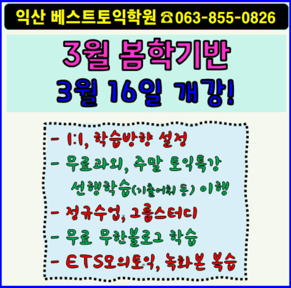 [익산토익학원] 조성우 학생 겨울방학특강 개강한지 18일만에 600 → 815 수직 상승! & 문장 구조 분석 베스트토익과 함께하면 이해와 설득으로 토익점수가 수직 상승하게 됩니다. 지난 포스팅에서 베스트토익의 조성우 학생이 18일만에 2026년 1월 25일 토익시험에서 600 → 815로 수직 상승한 소식으로 어떻게 해서 600에서 815로 간 것인지, 우연이 아닌 베스트토익의 개강전부터 체계적인 학습계획으로 성취할 수 있었던 것임을 전해드렸습니다. 자세히 보기 ▼▼ https://blog.naver.com/best-toeic/224201792261 익산베스트토익에서는 조성우 학생과 같은 케이스들이 다음과 같이 너무 많습니다. 더이상 다른 사람 성공 사례로 멈추지....... <img src="https://blogthumb.pstatic.net/MjAyNjAzMDVfMTY4/MDAxNzcyNzEyMzk4MDY0.Sw81pm90POIEZlZeDfPSeRMjpl07365mr9kYNOhV2Y4g.A-V8oaZY1yP9qUT_enG8Rcc4hT08i53HFC2r89O5ZyAg.PNG/316%B0%B3%B0%AD.png?type=s3" />