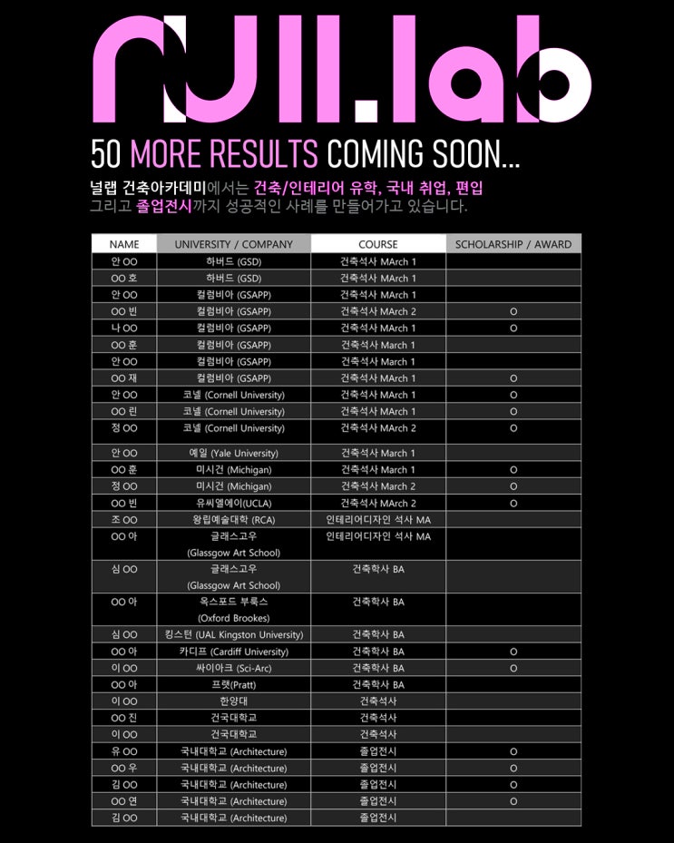 건축가에게 배우는 건축 디자인 널랩 아카데미입니다. 널랩 건축아카데미에서는 건축/인테리어 유학, 국내 취업, 편입 그리고 졸업전시까지 성공적인 사례를 만들어가고 있습니다. 2026년 널랩 학생분들 축하합니다. #널랩 #널랩아카데미 #건축유학 #건축포트폴리오 #바틀렛건축 #마야3d #건축프로젝트 #건축 #건축유학포트폴리오 #영국건축유학 #미국건축유학 <img src="https://blogthumb.pstatic.net/MjAyNjAzMDZfMTMz/MDAxNzcyNzIzMTYwMzc4.2pg-XuGMEtyQw63waz5XhQFzKCws5U-Bk1nb14DZRYsg.xiMB5qbVfe4yZzjMepAoTHs_KSrOyQwqw-e9yn3XYoQg.JPEG/2026_합격리스트_copy.jpg?type=s3" />