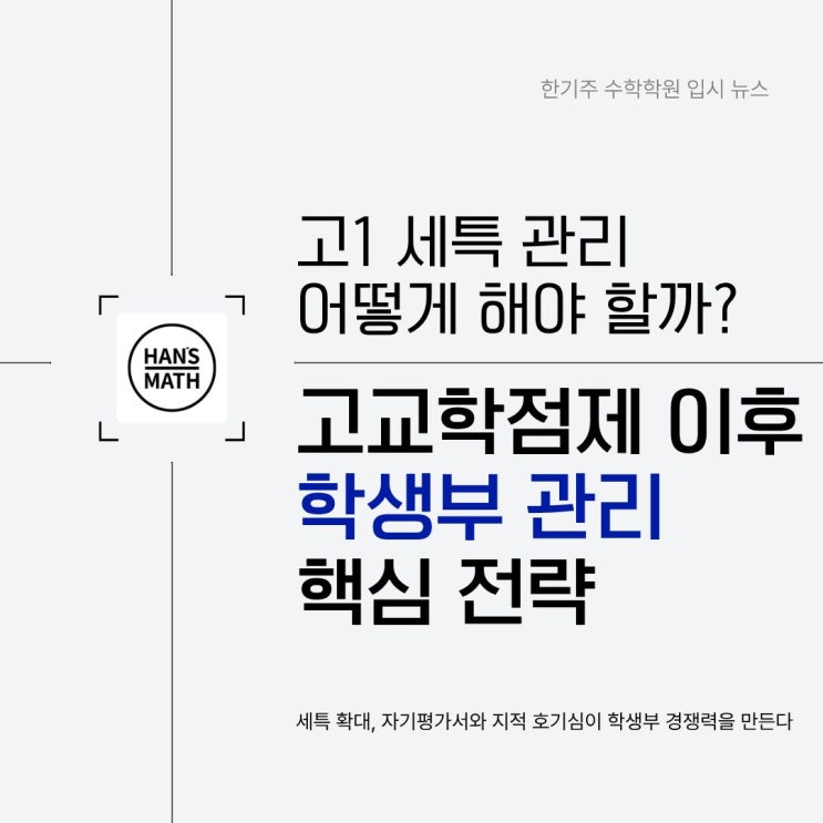 안녕하세요~ 언제나 정성을 다하는 30년 수학교육 전문 한기주 수학학원입니다! [고교학점제 이후 학생부 관리 핵심 전략] 고1 세특 관리 어떻게 해야 할까? 세특 확대, 자기평가서와 지적 호기심이 학생부 경쟁력을 만든다 안녕하세요. 한기주 수학학원입니다. 최근 고교학점제와 2022 개정교육과정이 적용되면서 학생부 관리 방식에도 큰 변화가 생기고 있습니다. 특히 세부능력 및 특기사항(세특)은 학생부종합전형뿐 아니라 앞으로 학생부교과전형에서도 점점 더 중요한 요소가 될 것으로 예상됩니다. 현재 고3 학생은 기본적으로 학년제 세특이 적용되지만, 고교학점제가 적용되는 고2와 고1 신입생부터는 기본적으로 학기제 세특이 적용됩....... <img src="https://blogthumb.pstatic.net/MjAyNjAzMDlfMTE3/MDAxNzczMDQxNzA0NTc5.bXFzfnqpmtOFpYSpvQQygw80mLw_O-RBYM3WYpwK2Ocg.q-pCBOBz41uo6T0R4XBNNsMLmTBkDSexiEKkl3iV6MMg.JPEG/1.jpg?type=s3" />