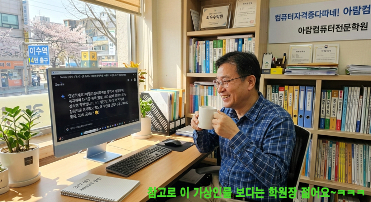 안녕하세요. 컴퓨터자격증다따네! 아람컴 아람돌이입니다. 2월 초 상담 신청한 여대생 학생과 야기 하다 등록을 받으면서 혹시 검색해서 오셨나요? 물어보니 네~ 제미나이한테 아람컴퓨터학원 어떤 학원인지 그리고 동작구에서 추천할 만한 컴퓨터학원을 찾아 달라고 했다는 거예요~~ 몇 개 중 정보 검색하다 저희 학원 홈피도 보고, 리뷰도 보고 바로 결정했다고 야기했던 것이 생각나 오늘 3월 7일 학원 원장실에서 작업하다 저도 제미나이 AI한테 한번 키워드 주고 검색해 보았습니다. 그렇더니 수초만에 장황하게 텍스트로 주룩주룩 나오는데 잘못하다 제미나이를 사랑할뻔 했습니다~ㅋㅋㅋㅋㅋ 뻥도 안치고 어쩜 거짓 없이 진솔하게 야기하....... <img src="https://blogthumb.pstatic.net/MjAyNjAzMDdfMzcg/MDAxNzcyODcyMjcxNjAy.mY_nLR1PWdn5DK4omIG2zz8lcWpRwTGh5Hus4JsXh-4g.fSbPvjUyEQhmn-JUF8WUxl8GTaEpq9U8qz3i7GRI_vkg.PNG/%B0%A1%BB%F3%C0%CE%B9%B0.png?type=s3" />