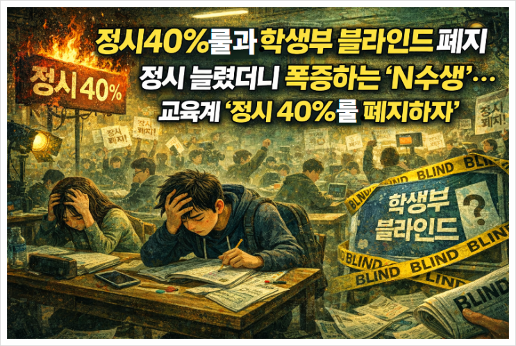 아버지, 저 재수할게요 정시 늘렸더니 폭증하는 ‘N수생’…교육계 “정시 40%룰 폐지하자” 이런 제목으로 모 일간지 기사가 올라 왔습니다. 지난 문재인 정부가 했던 일 중에 '아파트 값 폭증'과 '정시 40%룰' 강제 압박은 두고두고 책임을 물어야 할 중대한 잘못입니다. "누구를 위한 정시 40% 룰인가" 정부의 방침대로 고교 학점제 런칭 기준에 맞춰서 착실하게 70% 정도로 학생부종합전형을 진행하던 16개 대학에 문재인 정부는 갑자기 정부 대학 지원금 지급 조건으로 정시 40%룰을 강제했죠. 그래서 그 결과는 과연 어땠습니까? 대한민국은 의대 공화국이 되고, 고1부터 수능 올인한다며 학교를 자퇴하고, ....... <img src="https://blogthumb.pstatic.net/MjAyNjAyMjhfNCAg/MDAxNzcyMjU2ODE4NDk4.IiVE5QsaTvcWKz3mbkM2tc0YC6e3FEkx41Da9I3428wg._n5BOrrf8DZDBauiXjAvJHQFSU1reiBh9lX0AYFRCacg.PNG/image.png?type=s3" />