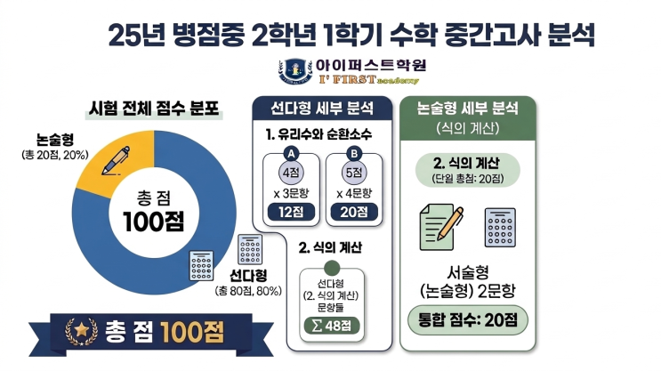 안녕하세요, 병점중 학부모님의 든든한 교육 파트너 아이퍼스트학원입니다. 오늘은 병점중학교 2학년 학생들을 위해, 작년(2025년) 1학기 중간고사 기출문제를 완벽히 해부하고 2026년 1학기 중간고사 100점 로드맵을 제시해 드리고자 합니다. 지피지기면 백전백승입니다. 작년의 흐름을 알면 올해의 100점이 보입니다. 2025년 병점중2학년 기출 분석: "기초와 응용의 결합, 변별력은 여기서 갈렸다" 1. 2025년도 병점중 2학년 1학기 중간고사 상세 분석 시험을 분석하는 이유는 명확합니다. 출제 경향은 반복되기 때문입니다. 작년 시험의 구성을 정확히 파악하는 것이 공부 방향 설정의 시작입니다. 25년도 병점중 2학년 수학 시험은....... <img src="https://blogthumb.pstatic.net/MjAyNjAzMjFfMTc0/MDAxNzc0MDg3MzE1NjQ1.IFCDgzsfjSlhUV2SHh3sGOJaUxtBktB4cXwtW9Y-IcAg.qv09YlPiEu5vW8KM95U1W_benlLKFvkibVfsYP8ebAwg.PNG/25%B3%E2_%BA%B4%C1%A1%C1%DF2-1_%C1%DF%B0%A3%B0%ED%BB%E7_%BA%D0%BC%AE%C7%A5.png?type=s3" />