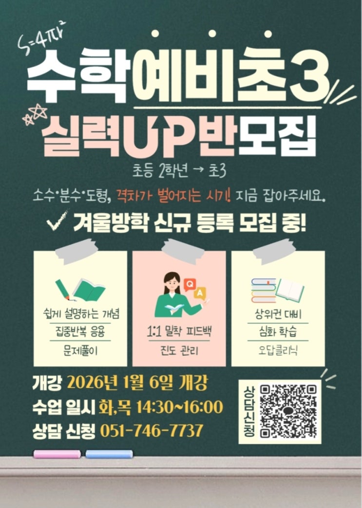 2026년 1월, 초3 1학기 전과정 선행 스타트! 안녕하세요 청담수학원 입니다. 초등2학년이 끝나면 3학년부터 수학 난이도가 ‘확’ 높아지는 거 아시죠? 자리값이 커지고 나눗셈이 본격적으로 나오며, 분수와 소수 개념까지 등장해요. 그래서 겨울방학 선행이 학습 격차를 줄이는 중요한 시기랍니다. 해운대 청담수학원에서는 2026년 1월부터 예비 초3 반을 정식 개강하며, 초3 1학기 전 단원을 꼼꼼하고 재미있게 잡아줄 예정이에요! 초등 저학년 수업은 이렇게 달라요! ✨청담수학원의 ‘예비초등3학년 맞춤 수업 방식’ ✔1. 교구 + 그림 기반 개념수업 초등저학년은 추상적인 설명보다 직접보고 만지고 비교하는 과정이 훨씬 효과적입니....... <img src="https://blogthumb.pstatic.net/MjAyNTEyMDVfMjk5/MDAxNzY0OTI1ODA0OTAy.W_9UF7G5hxTJmmFvm52KLg_9ig3oF933ZOl4hKo1oUgg.HYPJIncbwXcgNBmIfwxB6ULV3-aXGMqx1n9X359pbHMg.JPEG/900%A3%DFScreenshot%A3%DF20251203%A3%DF222453%A3%DFNAVER.jpg?type=s3" />