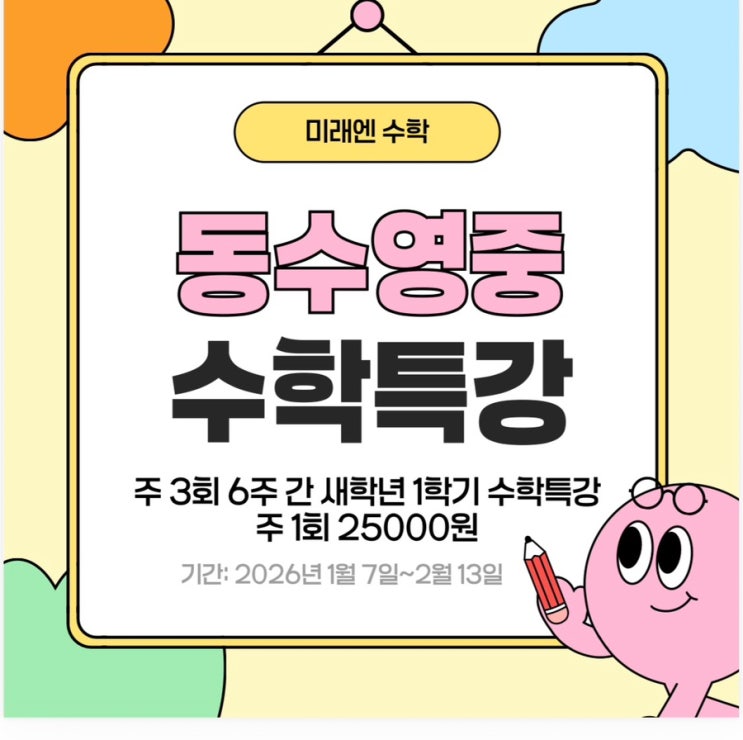 두달간 방학인 동수영중 맞춤 특강 신학기 예습 주3회 씩 6주간 수업 주3회 25000원 <img src="https://blogthumb.pstatic.net/MjAyNTEyMTVfMjMx/MDAxNzY1NzY1NDU0NjAx.TTvWUj_heEI3nPIT-9RF76Scs1W-eiJvEus8Ek1HPVsg.z2ZtrVk9pKPb2mJ-1Oh63W-vdgnwO5aQ7q-iMLUW02og.JPEG/IMG%A3%DF0497.jpg?type=s3" />