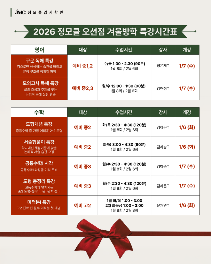 안녕하세요. 정모클 입시학원입니다. 정모클에서 2026년 1월부터 중고등부 방학 특강을 개강합니다. 시험 대비를 하면서 학생들에게 부족한 부분은 보완하고 새학기를 위해 꼭 들어야 하는 수업을 영어,수학 각 과목별·학년별·수준별 맞춤 수업으로 준비했습니다. 재원생 학부모님께는 학생별 맞춤 특강 안내가 별도로 나갈 예정입니다. 겨울방학 동안 내실있고 더 단단하게 준비하여 정모클 학생들이 새학기 전과목 A, 올 1등급을 가져가길 바랍니다. 첨부된 시간표를 확인하시고 궁금하신 점은 각 지점 학원 행정팀으로 문의주세요! 감사합니다. 상담 및 문의 [정모클 국신점] Tel. 070-7747-3088 H.P 010-2679-3088 [정모클 오션점] Tel........ <img src="https://blogthumb.pstatic.net/MjAyNTEyMTdfMTYx/MDAxNzY1OTUxODAxNzM1.vU8oiHWwAm3ZHP8Ikhy4EIHL9YH64L-N2_--P2PDhVgg.foWcWFMQoERM_PEya-A808uYoVDr5O22Uw4cvrHRM_Qg.PNG/%C6%AF%B0%AD%B0%D4%BD%C3%B9%B0_%BF%C0%BC%C7%C1%A1.png?type=s3" />