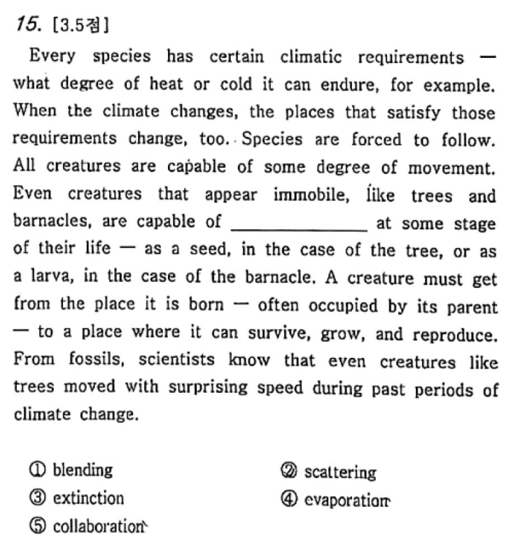 2025년 1학기 중간고사 15번 빈칸추론 문항 특징 ---------------------------------------- 시험범위 지문 내용 및 단어를 전혀 바꾸지 않음 빈칸문제를 빈칸문제로 변형 주석단어를 빈칸으로 활용 고등과정의 단어가 아닌 주석어휘는 시험문제로 출제를 꺼리지만 학생들이 주석단어까지 학습하지 않는다는 허점을 노림 . . . . . . . . . . . . . . . . . 실제 지문 빈칸 단어 -> dispersal : 분산 ② scattering 분산 학습할 때 주석단어도 같이 확인해주세요! <img src="https://blogthumb.pstatic.net/MjAyNTEyMDNfMTU0/MDAxNzY0NzQ0NjE5MzAz.2TCZy-hbuBsS13cULnCB2MvTEZMp3c7G0J_DyzBLcbcg.0TGXfMySrfiNgeeIn9G-UNTk-EKyboU0rfhE9Li1kEwg.PNG/image.png?type=s3" />