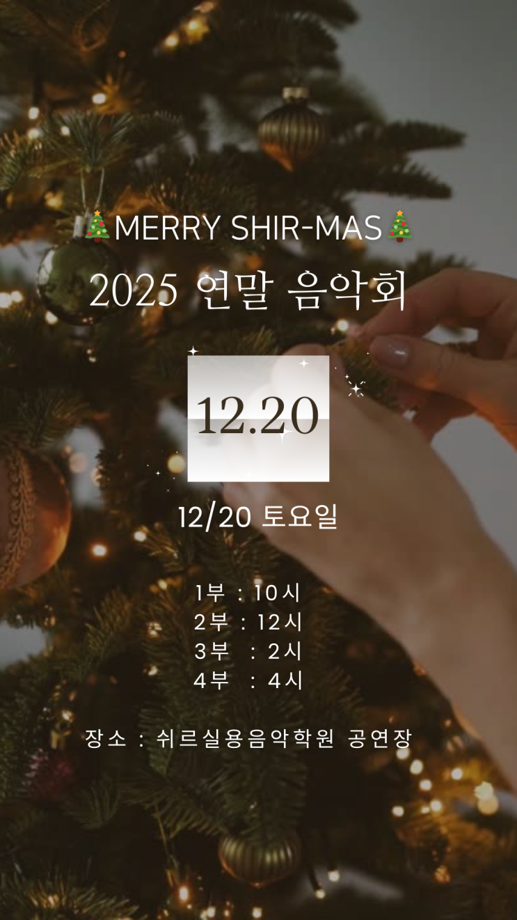 ⛄쉬르의 가장 큰 축제 ❄2025 연말 음악회를 앞두고 있습니다❄ ❄일시 : 12/20일 (토) - 1부 : 10시 - 2부 : 12시 - 3부 : 2시 - 4부 : 4시 장소 : 쉬르실용음악학원 공연장 *순서지는 개별 전송 예정입니다. *음악을 사랑하는 누구나 관람 가능❤ 음악회 준비하는 모든 수강생분들 화이팅! 미취학 아동부터 - 성인까지 ❤음악을 사랑하는 누구나 쉬르로 환영합니다❤ 문의 ) 010-5560-9150 <img src="https://blogthumb.pstatic.net/MjAyNTEyMDJfMjA5/MDAxNzY0NjgxNjI1Nzcz.WHlhlQaPxkyOVqn8WX3Djkxap-FmmhHRGv37cN8WENEg.F0VLbVdo8n7YkGCOqnUHOsLiWh5rLI14zEvfq6kdB7wg.PNG/Brown_Animated_Countdown_Days_Until_Christmas_Instagram_Story.png?type=s3" />