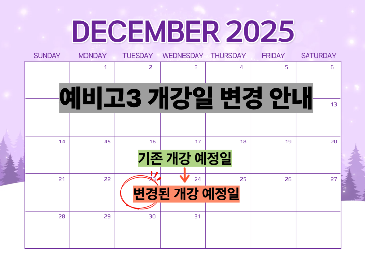 스윗스터디 영어학원 2025 예비고3 개강일 변경 안내드립니다 안녕하세요, 스윗스터디 영어학원입니다. 당초 저희 학원은 예비고3 정규반 개강을 12월 16일(화)에 진행할 예정이었습니다. 하지만 수원고 2학년(예비고3) 학생들의 기말고사 일정이 해당 주에 진행됨에 따라, 보다 안정적인 학습 환경을 제공하고자 개강일을 아래와 같이 조정하게 되었습니다. 시험기간 동안 학생들이 끝까지 집중력을 유지할 수 있도록 응원하며, 개강 준비 또한 최선을 다해 진행하겠습니다. 궁금하신 사항은 학원으로 언제든 편하게 문의 주세요. 감사합니다. 스윗스터디영어학원 <img src="https://blogthumb.pstatic.net/MjAyNTEyMTBfMjM0/MDAxNzY1MzUxNjEyMzk3.dndBSc1oiOJBQtmyaSzBcKK_s7M9uYACic51A0VQPXwg.rgoXUNW2B4APyGSppxsmng_NuGOWDAgxlwJs2NmC9Oog.PNG/image.png?type=s3" />