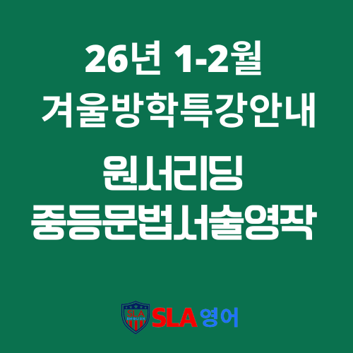 안녕하세요. SLA영어학원 Dana원장입니다. 26년 1-2월 오전 방학특강 안내드립니다. 'Early birds eat insects. 일찍 일어나는 새가 벌레를 잡아 먹는다' 속담처럼 방학이지만 아침에 일찍 일어나서 유익한 시간을 보내도록 합니다. 초등은 독서에 몰입하고, 읽기 및 쓰기와 원서 어휘 집중 숙지 및 단어로 문장, 단락 쓰기 수업으로 'Writing' 실력을 한층 더 다집니다. 중등은 영문법 개념을 숙지하고 서술형 영작 쓰기 훈련으로 내년 내신서술형 영작 문제를 미리 준비하는 시간이 될 것입니다. * 26년 겨울방학 일정표( 90분 수업 ) ◆겨울 오전 특강 기간 1월 5일(월)~2월 12일(목) ◆교육비 (주 2회, 총 12회) 초등 영....... <img src="https://blogthumb.pstatic.net/MjAyNTEyMDdfMjE2/MDAxNzY1MTA1NzU2MTI5.7IIMlfFKJW3cOcukPEtodjViwCY0YPx3cd5xgfsdiZAg.6gaPKkOOkn2iFkB2j5lK3Y-PUwCabtbXrpQuglQvgHcg.PNG/%BF%F8%BC%AD%B5%B6%BC%AD_%286%29.png?type=s3" />