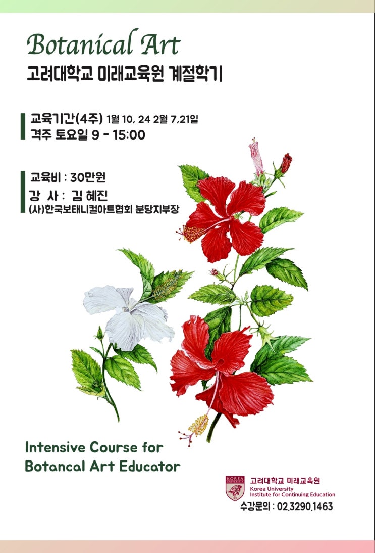안녕하세요~ 저는 겨울을 좋아하는데... 상상력을 펼치고 어떤 일에 몰입하기에 겨울만큼 좋은 계절도 없는 것 같아요. 아름다운 크리스미스 트리와 겨울에 어울리는 음악은 말해 뭐해요~ 오늘은 고려대학교 미래교육원 계절학기(1.2월 4회)를 소개하려고 해요. 25년 가을학기 신규개강에 이어 함께하고 있는데요... 겨울을 보태니컬아트로 하얗게 불태워보자구요.^^ 식물을 기록하는 예술, 보태니컬아트 고려대학교 미래교육원 겨울 집중 과정 안내 보태니컬아트는 식물을 정확한 관찰과 과학적 이해를 바탕으로 섬세하게 기록하는 예술 분야입니다. 빠르게 흘러가는 계절 속에서 한 잎 한 잎의 아름다움에 주목하며, 깊은 몰입과 집중의 시....... <img src="https://blogthumb.pstatic.net/MjAyNTEyMDJfNTUg/MDAxNzY0NjY5MzQ5OTc1.LpM00_RnrnTinAK7I5VeKN86tsOKPrzG4A1UtWQhKB8g.NWWBVMf2GndzVkU_xe110qGgsqOhjWh8XuKU0qh589wg.JPEG/%C5%D7%B5%CE%B8%AE.jpeg?type=s3" />