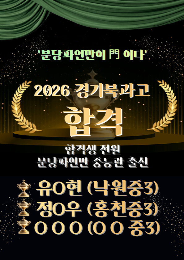 2026 경기북과학고 합격! 분당파인만에서 함께 만든 결과입니다 과학고 진학을 준비하는 과정은 단순히 수학,과학 A등급이 나온다고 되는 일이 아닙니다. 수학·과학의 ‘심화 개념과 원리이해’, 창의력 기반 문제 해결력, 그리고 사고 과정을 묻는 면접 준비까지 전체적인 학습 시스템이 탄탄하게 갖춰져야 합니다. 이번에 분당파인만 경기북과고 면접대비반에서 3명이 합격하게 되어 정말 기쁩니다! ✨ 이번 경기북과고 합격생 유○현 학생(낙원중 3) 정○우 학생(홍천중 3) o o o 학생(o o 중 3) 두 학생 모두 분당파인만의 체계적인 심화 수학·과학 커리큘럼을 충실히 따라왔고, 중3에는 경기북과고 준비 맞춤 프로그램을 통해 실....... <img src="https://blogthumb.pstatic.net/MjAyNTEyMTBfMjQ3/MDAxNzY1MzU5Mjg1Nzk1.pVBcsgpS1VFja83q3UoLHWXYzlXAgS1CThap3UmhDAEg.-buEsVHdpbzrEA-uaxKD4W56mw5eFy5a8ViaZigsLssg.PNG/%BA%B9%BB%E7%BA%BB_%BA%B9%BB%E7%BA%BB_%B0%E6%B1%E2%BA%CF%B0%FA%B0%ED%B0%ED4.png?type=s3" />