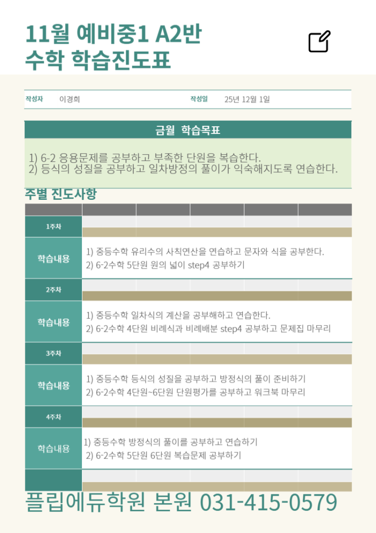 안녕하세요 플립에듀학원입니다. 초등부 중등부 1월5일 대개강에 앞서서 12월15일 1차개강을 준비중입니다. <중1수학> 12월 16일 중1(26년기준) 화목반 개강입니다. 교재 : 개념원리 중등수학1-1/ 라이트쎈 중등수학1-1/ 개념원리 중등수학1-2 시간 : 화목 3시30분~5시30분 (3월에 5시 30분으로 이동예정) 문의 : 031-415-0579 <초5수학> 12월 16일 초5(26년기준) 화목반 개강입니다. 교재 : 비상교과서개념잡기5-1/디딤돌기본+유형5-1/디딤돌개념5-2 시간 : 화목 1시30분~3시30분 (3월에 3시 30분으로 이동예정) 문의 : 031-415-0579 <img src="https://blogthumb.pstatic.net/MjAyNTEyMTJfMTY3/MDAxNzY1NDk4Mzg2ODAz.IojDTTTnOMbDbIdTWhb9UW3ymtEuocsRfbxWKaV9Fxwg.B83XW3WaO4ra3xJetkmrjhxaaqXEZZltBvnzuS_nxasg.PNG/1765420696508.png?type=s3" />