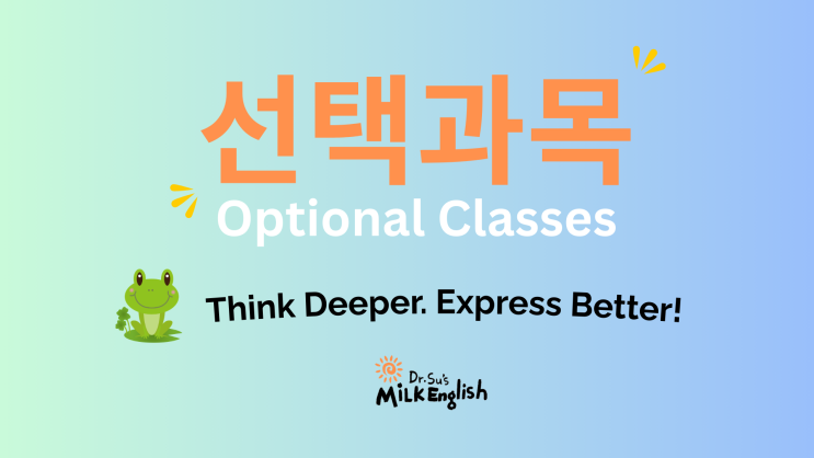 닥터수 밀크잉글리쉬 어학원 선택과목 프로그램 안내 닥터수 밀크잉글리쉬에서는 학생들의 생각하는 힘과 표현력을 확장하기 위한 선택과목 프로그램을 운영하고 있습니다. 각 프로그램은 학생의 흥미, 수준, 목표에 맞게 선택할 수 있으며 영어의 **4대 영역(읽기 · 쓰기 · 듣기 · 말하기)**과 함께 4C Skills (Cooperation, Communication, Creativity, Critical Thinking Skill)을 균형 있게 성장시키는 것을 목표로 합니다. 1️⃣ Gifted Lab 프리미엄 융합 영어 탄탄한 영어 실력을 바탕으로 사고력과 표현력을 확장하는 심화 프로그램입니다. ✔ 심화·확장: 기본기를 갖춘 학생을 위한 고난도 영어 학습 ✔ 몰입 환경: 원어민 선생님과 함....... <img src="https://blogthumb.pstatic.net/MjAyNjAzMTNfNyAg/MDAxNzczMzk1NjM1ODA3.m0e11h2TcnRT_5vV2jOuXbCpzvhSA7XQjdyc4zvnalwg.CcBlw54AVqs0Gm0wBh5j2VU0qWZS-YBney8rhoTL5IEg.PNG/Gifted_LAB.png?type=s3" />