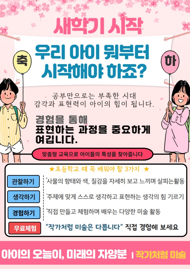 새학기, 우리 아이 무엇부터 시작해야 할까요? 새학기가 시작되면 영어, 수학, 학원 스케줄부터 고민하게 되죠. 하지만 요즘은 ‘많이 아는 아이’보다 ‘스스로 생각하고 표현할 줄 아는 아이’가 더 강해지는 시대입니다. AI가 정보를 대신 찾아주는 시대, 아이에게 필요한 힘은 지식을 외우는 능력이 아니라 자기 생각을 정리하고 표현하는 힘입니다. 공부만으로는 채워지지 않는 부분, 아이의 감각과 표현력은 결국 자존감으로 이어집니다 . 작가처럼 미술은 이렇게 다릅니다 26년 노하우를 직접 프로그램을 제작하여 더욱 깊이있게 수업합니다. 저희는 결과보다 과정을 더 중요하게 생각합니다. ✔ 관찰하기 사물의 형태, 색, 질....... <img src="https://blogthumb.pstatic.net/MjAyNjAzMDFfMTM0/MDAxNzcyMzQzMjMyNTY4.X1zOxzd7SrnPbc1hGHB-ZAhwsWx_9_Bbxyuodv74qKgg.iH0w13Xf6rDgjwOgKFKRvu8vwAl7-7jZZwZ9JmgaLpkg.JPEG/1772340081794.jpg?type=s3" />