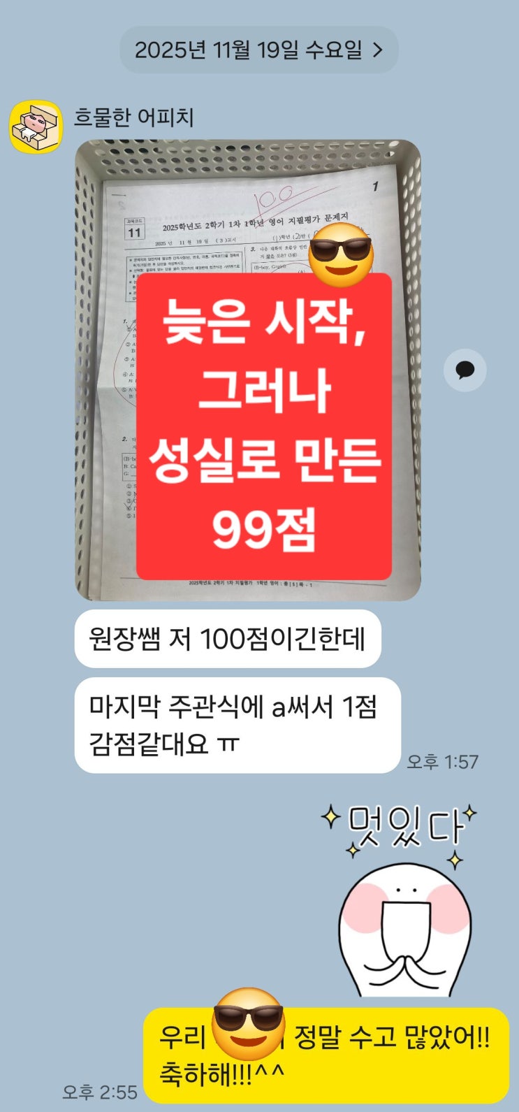 초등학교 5학년 후반 무렵, 영어를 처음 시작한 학생이 있었습니다. 숙제는 매번 해왔고 출석도 꼬박 했지만 그렇다고 눈에 띄게 열심히 하는 모습도 아니었습니다. 가끔 수업 중에 친구들의 교재를 힐끗 쳐다보며 자신의 교재와 비교하는 모습이 보이곤 했습니다. 제 눈에는 성실한만큼 꾸준히 느는 모습이 기특했지만 그 성장이 잘 체감되지 않았던 아이의 속이 어땠을지 제가 어찌 가늠할까요. 늦게 시작했다는 생각, 이미 앞서가는 친구들에 대한 막연한 거리감이 영어 앞에서 아이를 더 주눅들게 만든건지도 모릅니다. 그래서 중학교 1학년 때, 저는 아이에게 매주 한 시간씩 별도의 보충을 제안했습니다. 거절할수도 있겠다 생각했지만 아....... <img src="https://blogthumb.pstatic.net/MjAyNjAzMDFfNzUg/MDAxNzcyMzU2MDY3MjIz.ik-ZWUnguqM8Ti3WmVKAWrWKcGUrtVNktXTuPTtT1bQg.Fzht4XLiIOy1t1SBaPuG_hN2wOQd4AODdZjMzcoB9Z0g.JPEG/KakaoTalk_20260301_180659011.jpg?type=s3" />
