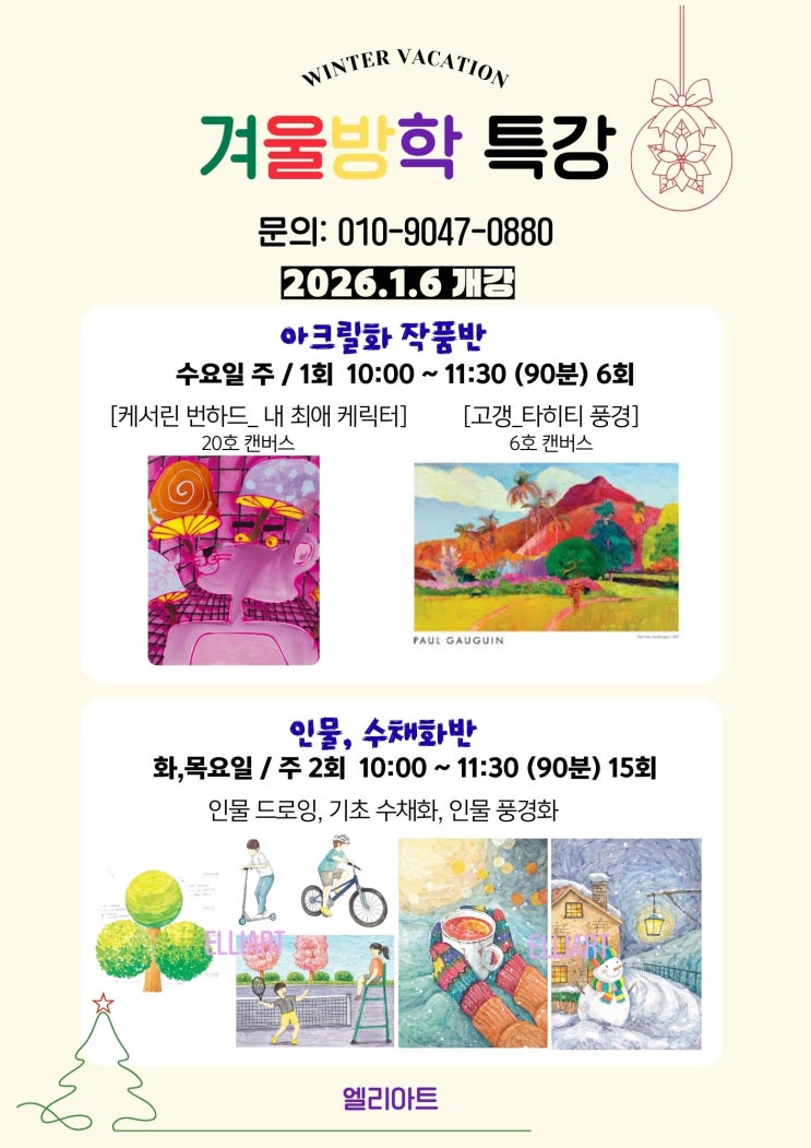 * 캔버스비용 별도* *90분 이상 소요 예상* 아크릴화 작품반 수업 내용 작품 감상과 작가와 작품 연구 레이어의 이해 아크릴화 스킬_ 마띠에르의 표현, 재료의 특성 연구 인물드로잉/ 기초 수채화반 수업 내용 이해 중심+ 스토리 텔링 인체 비례이해, 다양한 동세의 반복 학습 물감 농도 조절, 명암 표현 인체 동세의 응용과 본인의 스토리를 활용한 생활 수채화 학교, 집에서 잘 쓸 수 있는 표현 학습 겨울방학특강은 결석에 대한 보강이 없습니다. 신중한 결정이 필요해요~! <img src="https://blogthumb.pstatic.net/MjAyNTEyMDRfMjUy/MDAxNzY0ODU1MjYwMTAy.G-1dir2oNauXjkG08Y7dOhIm5iITIBe9vdgsQcp30lkg.6PB4nQmzq2s4AZFzjxTP9ZJuZVQpahjrRclXAeQFXwsg.JPEG/%B0%DC%BF%EF%B9%E6%C7%D0_%C6%AF%B0%AD.jpg?type=s3" />