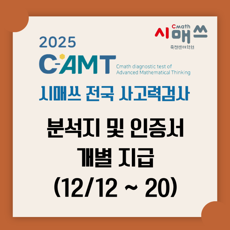 지난 11/23(일) 시행한 C-AMT 시매쓰 전국사고력검사 분석지와 인증서를 오늘(12/12)부터 개별 지급합니다. 아이들 편에 보내드리며, 학부모님께서 개별방문하셔서 수령하셔도 괜찮습니다. [대면 상담을 원하시는 경우] ✔️담임과의 상담 - 채널톡을 이용하여 상담 일시 조율 ✔️원장과의 상담 - 네이버 '학부모 상담' 예약 ✨이제 곧 겨울방학입니다. 겨울방학, 새학년을 위해 아이들의 학습을 점검하고 계획할 시기~!^^; <img src="https://blogthumb.pstatic.net/MjAyNTEyMTJfMzUg/MDAxNzY1NTA4NTMyODg1.qes3TsPrpw-SkEN-6RYMJfbpI40mdiH3zOsqi6altN4g.5OblF0196IQ4cGWjPLUrw917PvRhJe8jQuz3qBEExsMg.PNG/C-AMT_2025_%BA%D0%BC%AE%C1%F6_%B9%D7_%C0%CE%C1%F5%BC%AD_%C1%F6%B1%DE.png?type=s3" />