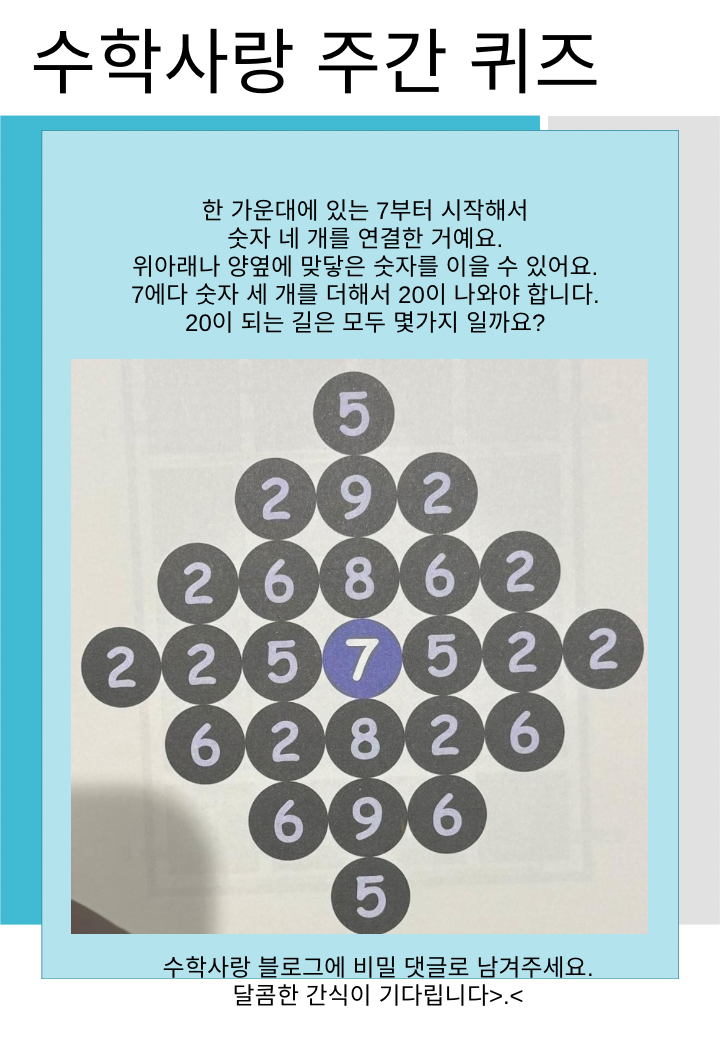 수학사랑 주간 퀴즈 이번 주 퀴즈는 집중력과 규칙 이해력이 모두 필요한 길 찾기 퍼즐입니다! 문제 안내 아래 그림에서 가운데 파란색 7에서 시작해 상하좌우 혹은 대각선으로 인접한 숫자로만 이동하며 총 4개의 숫자를 연결하는 퍼즐입니다. 7을 포함해 숫자 4개를 더한 값이 20이 되는 모든 경우의 수를 찾아주세요! • 숫자는 한 번 지났던 곳으로 다시 돌아갈 수 없어요. • 반드시 7에서 출발해야 합니다. • 7 + (이동한 세 숫자) = 20이 되어야 합니다. • 가능한 모든 경로의 개수를 구해 댓글에 남겨주세요. 문제 그림 수학사랑학원 정보 • 주소: 경기도 용인시 수지구 상현동 원희캐슬 A동 6층 엘리베이터 앞 •....... <img src="https://blogthumb.pstatic.net/MjAyNTEyMDJfMjk3/MDAxNzY0NjQ0Njg0NDkz.czY_B0RuNgx0B1yonLKjMZcBptTevOcoh6EuxEAYRAEg.AkdN13OlcbypWrXXT5_YAc50m5Kyyu9_DNGcRlboalkg.PNG/%C7%C1%B7%B9%C1%A8%C5%D7%C0%CC%BC%C71.pdf.png?type=s3" />