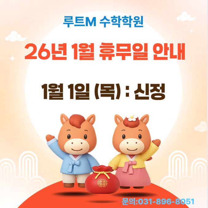 안녕하세요~! 올해도 벌써 얼마 안남았네요~ 저희 루트엠 수학학원의 2026년 1월 휴무일 안내드립니다. 1월 1일 목요일은 신정으로 쉽니다. 참고로 아이들의 방학이 얼마 남지 않았지요? 방학과 함께 1월 12일 부터 정규특강이 시작 됩니다. 아이들에게 많은 격려와 응원 부탁 드립니다. 25년 올 한해 마무리 잘 하시고 가정에 평화와 행복이 함께 하시길 바랍니다. 저희 루트엠 수학 학원을 항상 믿고, 응원 해 주시는 부모님들께 항상 감사드립니다. [제 2187-7호] 루트엠 수학학원 [제2911-6호] 루트엠 고등학원 <img src="https://blogthumb.pstatic.net/MjAyNTEyMTFfMjYy/MDAxNzY1NDQ1NTY1NjUx.BZ_8_DDrwwsJD3IifLX720HO0BpW104x9SKHzLIkae4g.JSvkSQsNF-3IEItFxKJ0hkVCHIRSKyVUfKVbjO04am8g.JPEG/1%BF%F9_%C8%DE%B9%AB.JPG?type=s3" />