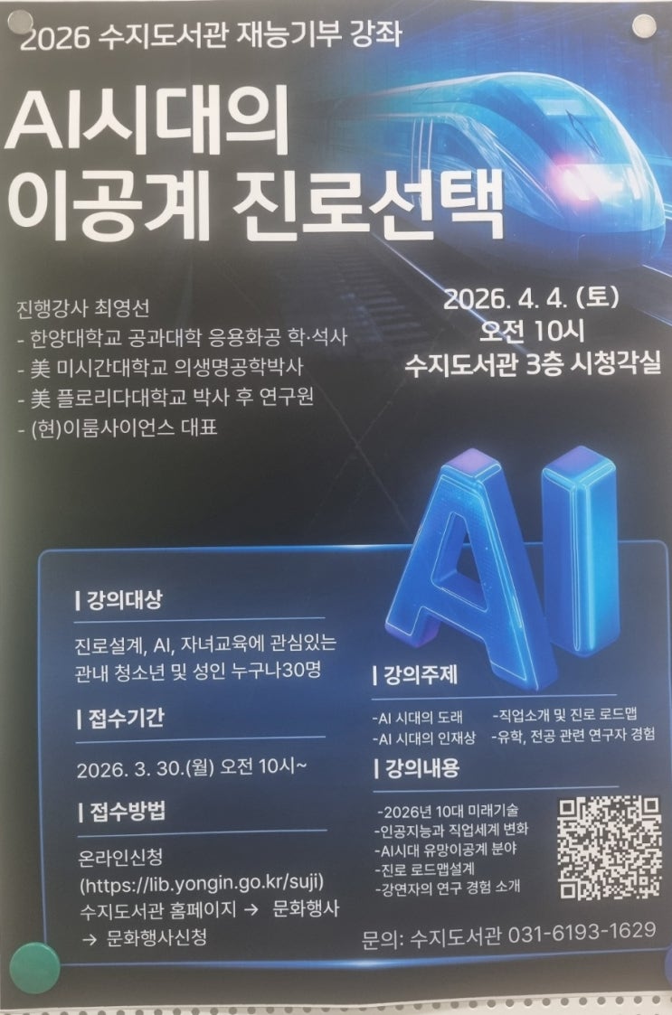 #AI시대직업선택 #수지도서관강좌 #수지영어도서관 #수지구청영어공부 수지도서관에서 아주 유익한 강좌가 열립니다 꼭 참석해서 미래 직업에 관한 고민해보는 기회가 되기를 바랍니다 ^^ <img src="https://blogthumb.pstatic.net/MjAyNjAzMTZfMTM4/MDAxNzczNjQ1NjA1OTAz.mfAEEJFckVAcjAeGrNjm85xtCQq1kAbWCYd_IZ40mgkg.zi2MXMh_FwKDRQvOXrLtStYKDHzrwUSHtWPWZu8eWiMg.JPEG/900%A3%DF1773645510957.jpg?type=s3" />