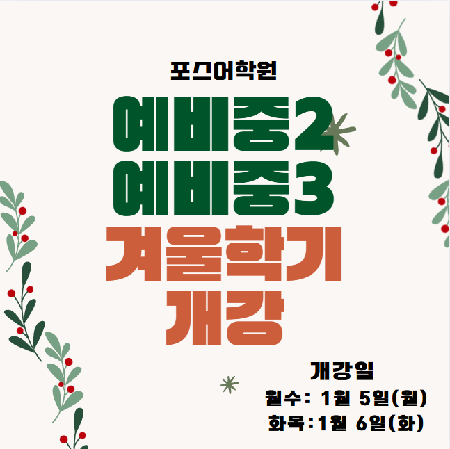 안녕하세요. Focus on Students 포스어학원 입니다. 어느덧 한 한 해를 마무리하며 새로운 학년의 새로운 시작을 준비할 시기가 다가왔습니다. 아이들이 흔들림 없는 탄탄한 기본기와 문제를 해결하는 능력을 함께 기르며 보람있는 겨울 방학을 보낼 수 있도록 포스어학원에서 준비한 겨울학기 수업을 안내드리겠습니다. 포스어학원 예비중2 · 예비중3 겨울학기 개강 대상 : 2025년 현 중1, 중2 개강일 : 1월 5일(월) / 1월 6일(화) 예비중2 겨울학기 ▶ 학기 : 1월 - 2월 (2개월) ▶ 수업일 : 월수/화목 ▶ 수업 시간 : 5시 40분 ~ 9시 5분 (4교시 수업) ▶ 수업 과목 : 문법+서술형 / 구문독해 / 리스닝 예비중3 겨울학기 ▶ 학기 : 1월 - 2월....... <img src="https://blogthumb.pstatic.net/MjAyNTEyMTJfMTAg/MDAxNzY1NTI4MDEyMzE2.46dWaa95hqxZwUgjj_r2hcoYkpHUbktmevXfq5dgDqEg.5rY09KXyjzduoPmII3ueQ3KEQClsIk9SU0M2yiBgwvYg.PNG/image.png?type=s3" />