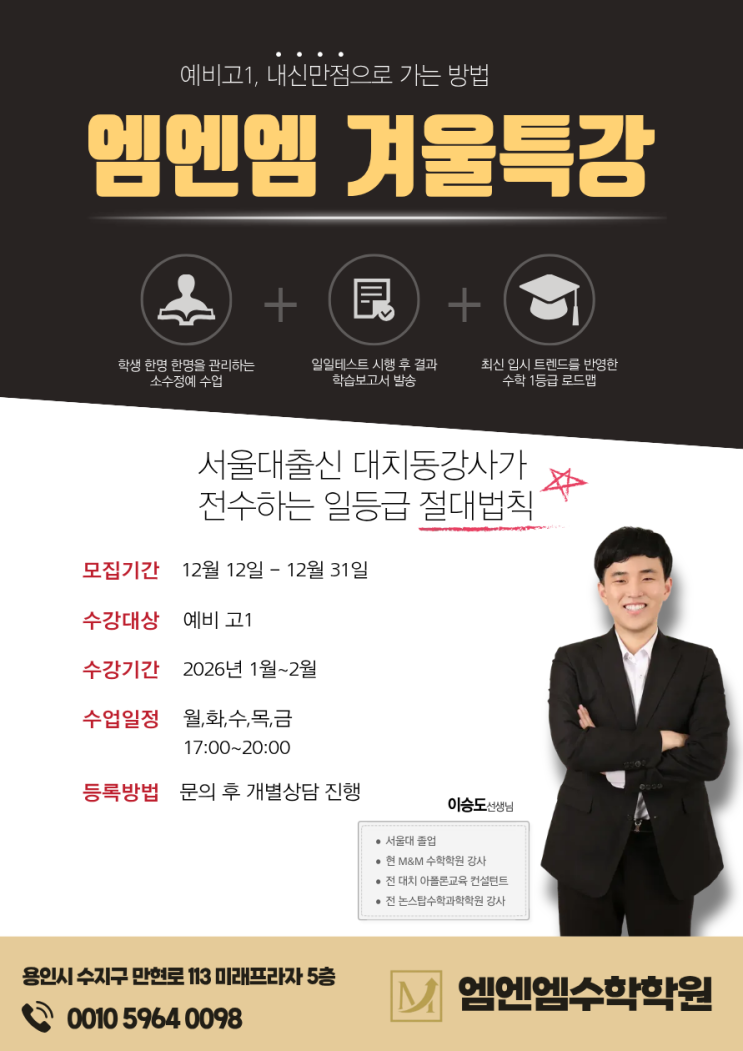 안녕하세요, 엠엔엠 수학학원입니다. 이번 겨울방학 특강 모집 기간 동안 학부모님과 학생 여러분께서 보여주신 폭발적인 관심과 문의에 진심으로 감사드립니다. 여러분의 뜨거운 교육열과 성원에 보답하고자, 고1(예비고1) 대상 오후 특강반을 새롭게 신설하게 되었습니다! 단순히 반을 늘리는 것을 넘어, 더욱 완벽한 수업 퀄리티를 위해 최고의 선생님을 모셨습니다. [NEW] 예비고1 오후 특강반, 무엇이 특별한가요? 1. 서울대 출신 강사의 '명품 강의' 이번에 신설되는 오후반은 학생들의 요청을 적극 반영하여, 최상위권 도약을 위한 핵심 강의로 구성했습니다. 특히 이번 특강을 위해 서울대학교 출신의 실력파 선생님을 특별 초....... <img src="https://blogthumb.pstatic.net/MjAyNTEyMTRfMjUx/MDAxNzY1Njc5MzA1Mjcz.HYqFopS1_TwqmraZXMCMVdKXyukNmk7O7nInyaB_25Mg.yOdYtL1ooBSyszcAgdlj2gu60DopxZbcfSXQbfqA0Mog.PNG/%B0%DC%BF%EF%B0%ED1%C6%AF%B0%AD.png?type=s3" />