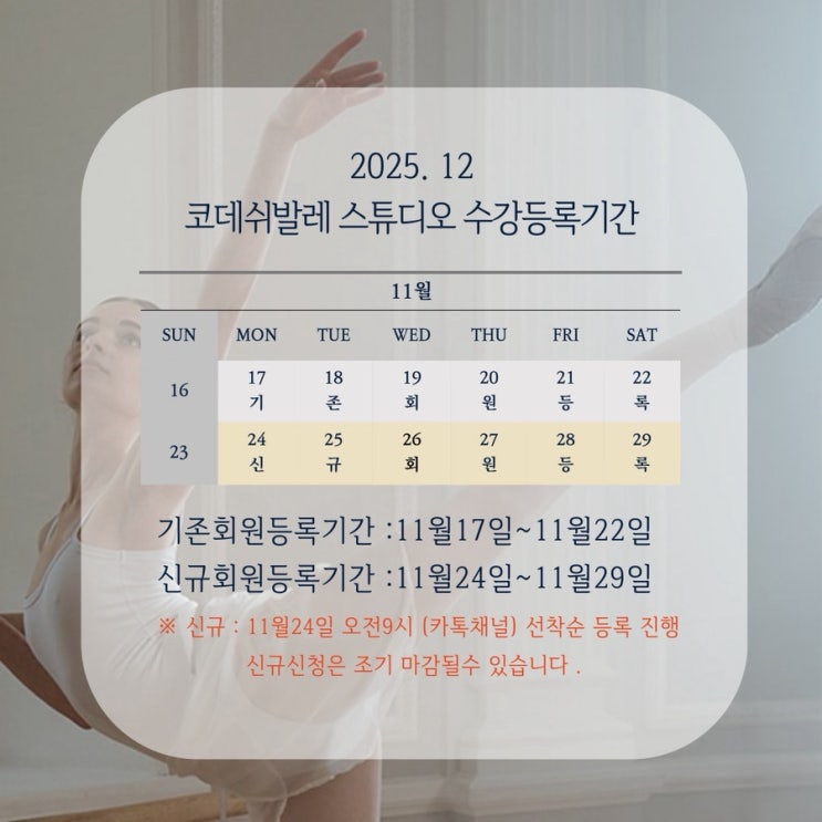 코데쉬 발레스튜디오와 함께 따뜻한 연말 맞이하세요 12월 수강 시간표 12월이 다가오면서 한 해를 마무리하는 마음이 어느 때보다 깊어지는 시기입니다. 아이들과 어른 모두, 차분한 겨울 속에서 몸과 마음을 아름답게 채워주는 발레 수업으로 올해를 따뜻하게 마무리해보는 건 어떨까요? 방문 상담 & 등록 전 상담 안내 수강 상담이 필요하신 분은 스튜디오로 사전 연락 후, 방문 예약 일정을 잡아주세요. (전화, 카톡채널 채팅 상담 모두 가능합니다) 031-8055-7484 ※ 상담만으로는 등록 확정 또는 대기 등록이 되지 않습니다. 반드시 등록 절차를 완료해 주셔야 합니다. 문의 및 채널 안내 •카카오톡 채널 : 코데쉬발....... <img src="https://blogthumb.pstatic.net/MjAyNTExMTZfMTcx/MDAxNzYzMjk1NTI0MDc5.5Ki_0EIGENC1dmidAu52vXKSlCYshxSzndQCc-4QVTcg.sQSwC6vhO4S5DH3anw7MWScj8cnjyiHlZXFMaZEoyPAg.JPEG/IMG%A3%DF0256.JPG?type=s3" />