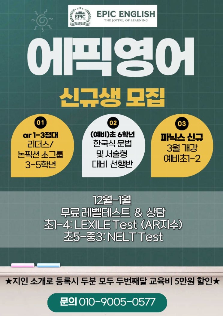 안녕하세요, 수잔 원장입니다. 오늘은 정말 반가운 소식을 전해드리려고 해요! 바로바로~! 금 or 토 주 1회 내신/ 선행 class가 개설되었습니다 금요 주 1회 class (12/5 1차 개강) 토요 주 1회 class (12/6 1차 개강) 대상: 중1~고1 ✔ 문법은 원장 직강으로 탄탄하게 문법 수업은 Susan 원장이 직접 수업합니다. 기초 개념부터 내신 문법까지 정확하게 잡아주는 체계적 문법 수업! ✔ 주 1회만으로 효율적인 내신/ 선행 관리 -금요일,토요일 내신반: 각 학교 전담 선생님의 노하우 수업 -금요일,토요일 선행반: 특목/ 자사고 대비 자세한 사항은 문의 부탁드립니다. 수잔원장: 010.9081.2659 <img src="https://blogthumb.pstatic.net/MjAyNTExMTlfMjQw/MDAxNzYzNTM2ODM5NjE0.rfajSndrkNhcpcgArOsbRoZfa7qaFZjtKkx_Ka3ssXAg.f0B5YoeznGZrTSgJ-5G15rzaNtSrML3q2nQHRc9dNXYg.JPEG/%C1%A6%B8%F1%C0%BB-%C0%D4%B7%C2%C7%D8%C1%D6%BC%BC%BF%E4_-001_-_2025-11-19T161926.226.jpg?type=s3" />