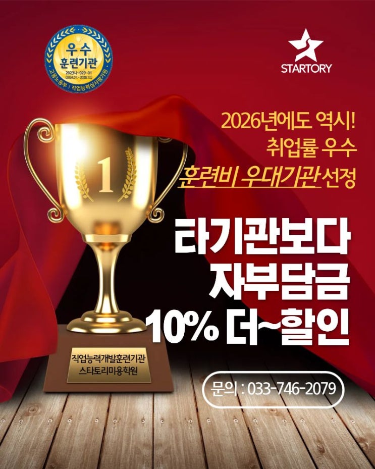 ✨ 원주미용학원 스타토리뷰티아카데미 2026년에도 역시! 취업률 우수 훈련비 우대지원 훈련 기관 선정 국비지원 내일배움카드 자부담금 타 기관 대비 10% 추가 할인 미용 자격증 준비, 취업까지 확실하게! 원주에서 미용을 제대로 배우고 싶다면 역시 스타토리뷰티아카데미죠 2026년에도 다시 한번! 고용노동부 취업률 우수 훈련비 우대지원 훈련 기관으로 선정되면서 국비과정의 전문성과 취업 지원력까지 공식적으로 인정받았습니다. 왜 스타토리뷰티아카데미인가? ✔ 2026 취업률 우수 훈련비 우대지원 훈련 기관 선정 매년 높은 취업률을 기록하며, 실제 수강생 후기 만족도도 높은 학원! 자격증 합격은 기본, 실무 기반 커....... <img src="https://blogthumb.pstatic.net/MjAyNTEyMTBfMjM3/MDAxNzY1MzU2ODYyMTIy.cweyX6vWfEKUR-E6v4Cs8nkZOreoQh5bYScXW5CY7lQg.miJk7B0jjXw5hnE74oQgPyjEx3KbeWKlpcwgLAjBKrgg.JPEG/KakaoTalk_20251210_175254848.jpg?type=s3" />