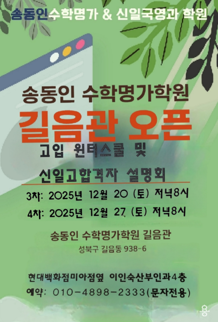 송동인수학명가 4층 신일고 합격생들을 위한 학부모 설명회 고등학교 현1.2.학년 대상 하부모설명회 겨울방학이 성적을 올리는 기회 입니다. 송동인수학명가길음관 이아숙 산부인과 4층 <img src="https://blogthumb.pstatic.net/MjAyNTEyMTVfMjY1/MDAxNzY1NzgyNDQ5NjE4.GUk0UmWcWD8pZWBGXXop57URLc844E-TyLZu-0lP7Wkg.nlpwKjBpIm0Xp5TP0ZSmkhiFc-AD_pIk93IpT93lnqsg.PNG/900%A3%DF1765781750181.png?type=s3" />