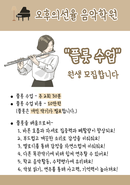안녕하세요 오후의선율입니다 :) 강북구 번동에서의 오후의선율은 "플룻 수업"과 "전자드럼 수업"을 진행했었기 때문에! 양주 옥정의 오후의선율에서도 진행해보려고 합니다^^ 오후의선율에서 플룻을 배워서, 중학교 때 오케스트라 들어간 아이들도 정말 많았구요! 오케스트라로 들어간 친구들이 결국 악기로 입시 준비를 하고 있네요 :) 언제든지 문의주세요 :) #오후의선율 #오후의선율음악학원 #양주피아노학원 #양주음악학원 #옥정음악학원 #옥정피아노학원 #율빛초등학교 #옥빛초등학교 #플룻모집 <img src="https://blogthumb.pstatic.net/MjAyNTEyMThfMjU4/MDAxNzY2MDMxMzg2NjM3.nJ_w6QnSUwu9qal9s4dUC8tTf2b2UpywAhVSeajfK8Ig.14dwDs9AlTmNkXccvsS6Z2Cxs2dOl8pYNs5bmmREyrwg.PNG/%C7%C3%B7%ED_%B8%F0%C1%FD_%BB%E7%C1%F8.png?type=s3" />