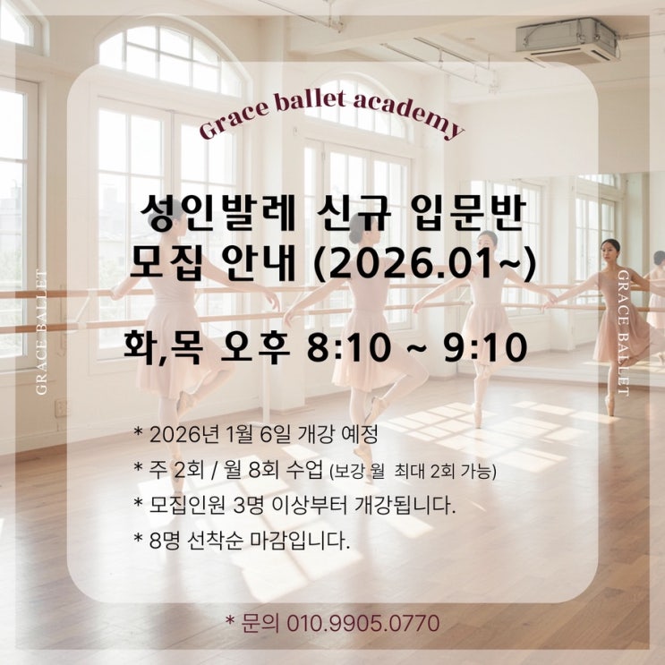 GRACE BALLET 많이 기다려주셨던 성인발레 입문반이 2026년 1월 개강됩니다✨ 기존 반에 섞여 수업을 하지 않는, 모두 다같이 맨-처음반 개강입니다. * 이번 입문반은 그동안 문의 주셨던 분들이 많아 더 빠르게 정원 마감 될 예정입니다. 학원에 연락주시면 방문 or 전화 상담 후 원서 등록되는 순으로 정원 마감됩니다. 빠른 고민해주시고 연락주세요 < 신규 성인 입문반 모집 안내 > • 매주 화,목 오후 8:10-9:10 • 2026년 1월 6일 첫 수업 예정 • 선착순 8명 3개월 결제 시 15% 할인! • 상담은 꼭 예약 방문 상담 바랍니다 그레이스 발레의 모든 수업은 12년차 지도 경력의 원장&부원장 직강으로 레벨별 수업....... <img src="https://blogthumb.pstatic.net/MjAyNTEyMDlfMjMz/MDAxNzY1MjY2ODE4NjY0.mu-nApFoMb1EeCWBVKe3PrPEA2yLvHWe21tzWxKL6GIg.AdWkSTgzTplVt5IlrIUN9J6OgHDCKgVhYP1LAe9TBLAg.JPEG/IMG%A3%DF6542.JPG?type=s3" />