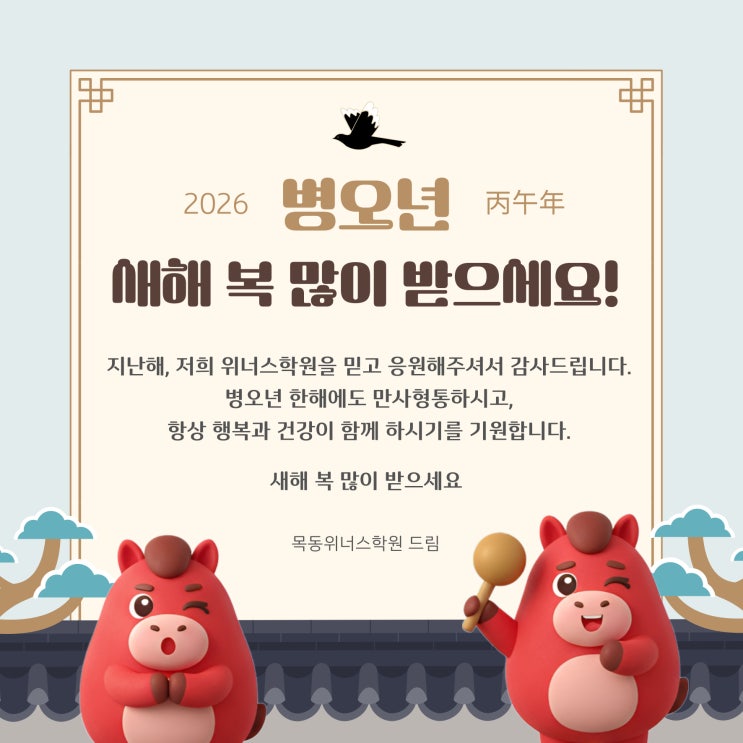 안녕하세요, 위너스학원장 CHARLIE입니다. 위너스학원에서 우리 아이들과 호흡을 맞춘지 벌써 5년이 되어가네요. 그동안 여러 힘든 과정을 잘 이겨낸 우리 아이들에게 큰 박수를 보냅니다. 점차 성장해가는 우리 아이들의 미래에 도움이 되는 중요한 디딤돌이 될 수 있도록 꾸준히 노력하는 위너스학원이 되겠습니다. 새로운 해에도 우리 아이들에게 최선을 다해 지도하겠습니다. 학원 겨울 방학은 1월 26일(월) 부터 1월 29일(목) 까지입니다. 모두가 재충전하고 다시 한 번 힘낼 수 있는 시간이 되기를 바랍니다. 감사합니다. [1월 30일 (금) 부터 정상 수업이 진행됩니다.] <img src="https://blogthumb.pstatic.net/MjAyNTEyMThfODgg/MDAxNzY2MDUyMzE2MTg5.EwdV-3YnlrvbwIHBOII2I9tOmS5dTrAplc73wr6jRzEg.5DXoUPMMDlsSrxq3oYXHDA-BLA08Nx5I22bTurzyT68g.JPEG/2026-%BB%F5%C7%D8%C0%CE%BB%E7_%C0%A7%B3%CA%BD%BA_-001.jpg?type=s3" />